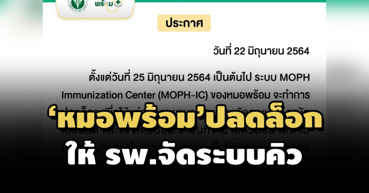 ผู้สื่อข่าวรายงานว่า เมื่อวันที่ 22 มิ.ย.2564 เพจเฟซบุ๊ก หมอพร้อม โพสต์ข้อความระบุว่า ตั้งแต่วันที่ 25 มิ.ย.2564 เป็นต้นไป ระบบ MOPH Immunization Center (MOPH-IC) ของหมอพร้อม จะทำการปลดล็อก เพื่อให้แต่ละโรงพยาบาลสามารถจัดระบบคิว ลงนัด เลื่อนนัด และแจ้งเตือนประชาชนที่จะมาฉีดวัคซีนได้ตามความเหมาะสม เนื่องจากบริบทแต่ละพื้นที่มีความแตกต่างกัน