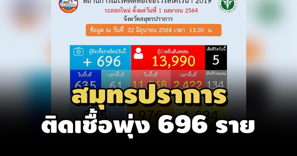 จังหวัดสมุทรปราการ พบผู้ติดโควิดพุ่งถึง 696 ราย พบมากสุดในอำเภอบางพลี 379 ราย รวมผู้ป่วยสะสม 13,990 ราย ดับอีก 5 ราย ทำให้มียอดรวมผู้เสียชีวิตอยู่ที่ 134 ราย