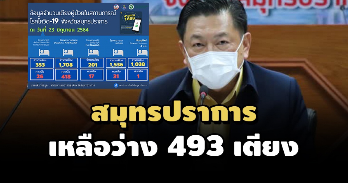 สำหรับจำนวนเตียงผู้ป่วย โรงพยาบาลรัฐสังกัดสำนักงานปลัดกระทรวงสาธารณสุข จำนวนเตียง 353 เตียง คงเหลือ 26 เตียง โรงพยาบาลสนาม มหาวิทยาลัยราชภัฏธนบุรี สมุทรปราการ (Hospitel และ Field Hospital) จำนวน 1,708 เตียง คงเหลือ 418 เตียง โรงพยาบาลรัฐสังกัดอื่น ๆ จำนวน 201 เตียง คงเหลือ 17 เตียง (ไม่มี Hospitel) โรงพยาบาลเอกชน จำนวน 1,536 เตียง คงเหลือ 31 เตียง ฮอสพิเทล โรงพยาบาลเอกชน 4 แห่ง จำนวน 1,038 เตียง คงเหลือ 1 เตียง