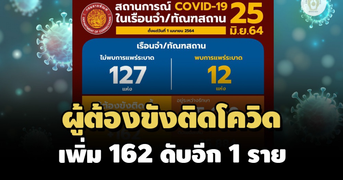 ผู้สื่อข่าวรายงานว่า เมื่อวันที่ 25 มิ.ย. 2564 นายอายุตมั สินธพพันธุ์ อธิบดีกรมราชทัณฑ์ เผยสถานการณ์การแพร่ระบาตของโรคติดเชื้อไวรัสโควิดในเรือนจำและทัณฑสถาน มีผู้ต้องขังติตเชื้อรายใหม่ จำนวน 162 ราย รักษาหายวันนี้ 515 ราย เสียชีวิต 1 ราย ทำให้มีผู้ต้องขังติดเชื้อที่ยังอยู่ในการดูแลของกรมราชทัณฑ์ 5,010 ราย