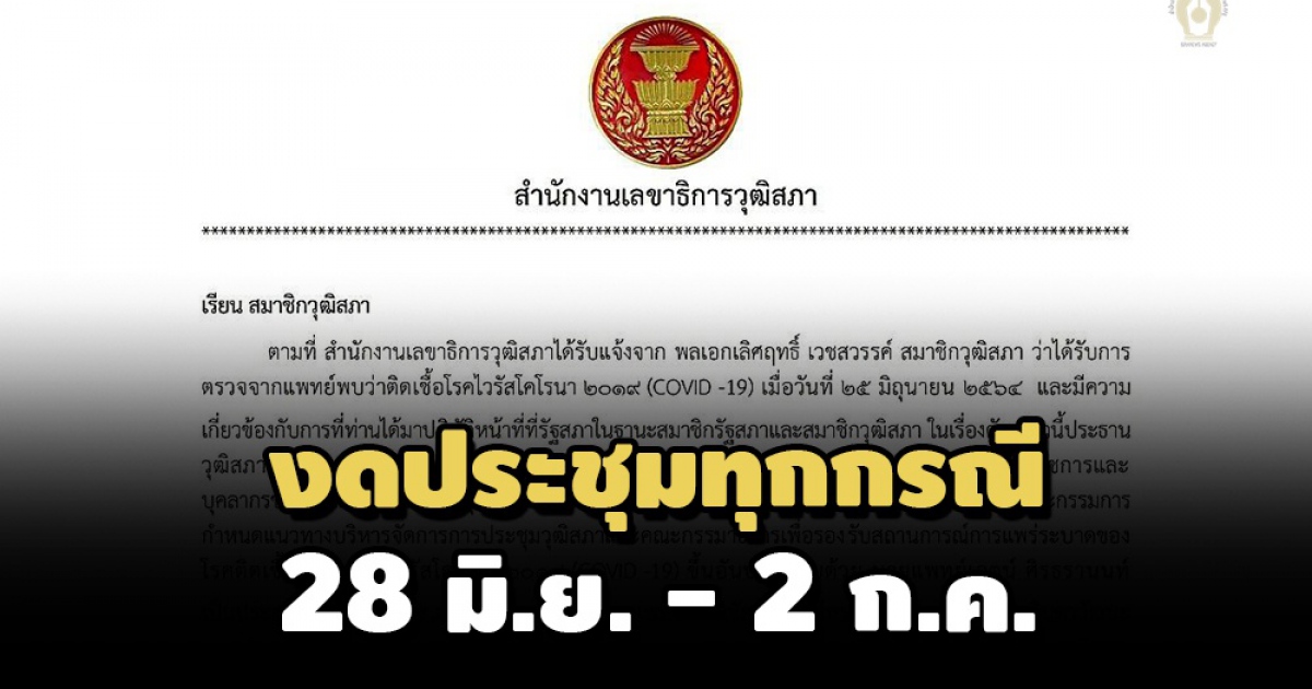 สำนักงานเลขาธิการวุฒิสภา ประกาศงดประชุมทุกกรณี ระหว่างวันที่ 28 มิ.ย.-2 ก.ค.64 หลังสถานการณ์การระบาดใน กทม. มีแนวโน้มพบผู้ติดเชื้อสูงขึ้น ขณะที่ภายในอาคารวุฒิสภา พบ ส.ว. ติดโควิด และมีผู้สัมผัสเสี่ยงสูงอีก 9 ราย