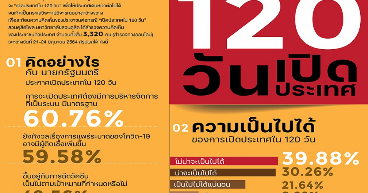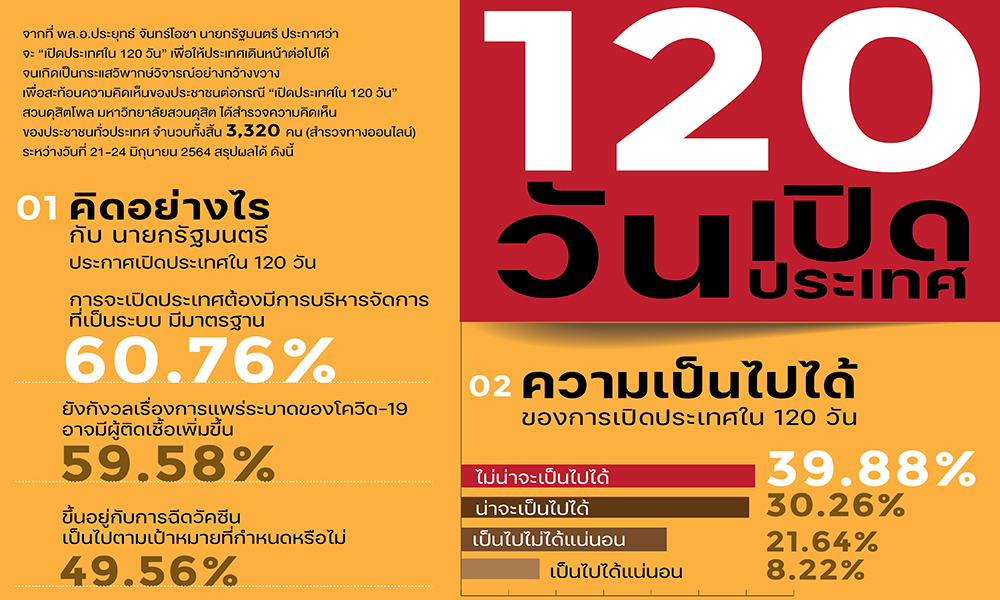 ผลการสำรวจความคิดเห็นของประชาชนต่อกรณี “เปิดประเทศใน 120 วัน” ของสวนดุสิตโพล กลุ่มตัวอย่าง ร้อยละ 84.04 มีความคิดเห็นว่า การเปิดประเทศจะทำให้เศรษฐกิจเดินหน้า ประชาชนทำมาหากินได้ เมื่อพิจารณาถึงความเป็นไปได้ของการเปิดประเทศใน 120 วัน กลับพบว่ามีกลุ่มตัวอย่างที่คิดว่าไม่น่าจะเป็นไปได้ถึง ร้อยละ 39.88 ข้อมูลดังกล่าวสะท้อนให้เห็นถึงความไม่เชื่อมั่นและความวิตกกังวลของประชาชน ซึ่งเป็นโจทย์ที่ท้าทายการทำงานของรัฐบาล แต่อย่างไรก็ตาม เราไม่ควรฝากความหวังไว้กับรัฐบาลเพียงอย่างเดียว การเปิดประเทศจะสำเร็จได้ทุกคนต้องช่วยกัน รัฐบาลต้องบริหารจัดการอย่างเป็นระบบและทบทวนความเหมาะสมเป็นระยะ ทุกภาคส่วนต้องร่วมมือกันอย่างจริงจัง เห็นประโยชน์ของส่วนรวมเป็นที่ตั้ง ประชาชนต้องศึกษาข้อมูลให้รู้เท่าทันโรค/วัคซีน การใช้ชีวิตแบบ Next Normal และยังคงต้องตั้งการ์ดแบบสูงสุดเสมอแม้ว่าจะได้รับวัคซีนแล้วก็ตาม เพื่อให้เราสามารถหยุดการระบาดของโรคได้ และการเปิดประเทศก็จะไม่ไกลเกินเอื้อมอีกต่อไป