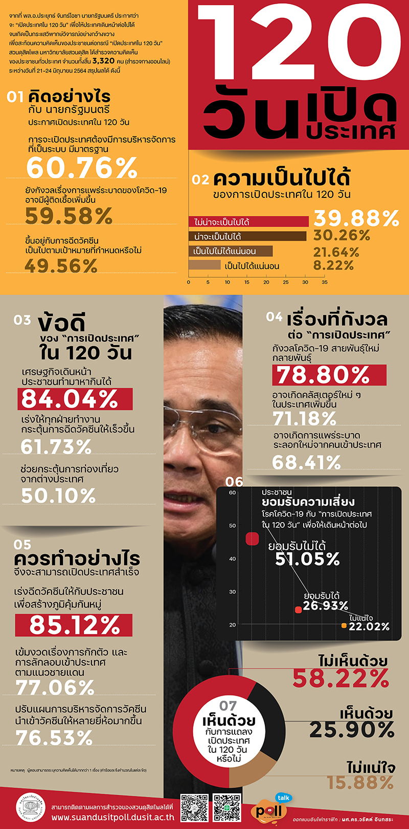 สวนดุสิตโพล มหาวิทยาลัยสวนดุสิต สำรวจความคิดเห็นของประชาชนต่อกรณี “เปิดประเทศใน 120 วัน” กลุ่มตัวอย่างจำนวน 3,320 คน สำรวจวันที่ 21 - 24 มิถุนายน 2564 พบว่า ส่วนใหญ่มองว่าการจะเปิดประเทศ ใน 120 วัน ต้องมีการบริหารจัดการที่เป็นระบบ ร้อยละ 60.76 คิดว่าไม่น่าจะเป็นไปได้ ร้อยละ 39.88 ข้อดีคือทำให้เศรษฐกิจเดินหน้า ประชาชนทำมาหากินได้ ร้อยละ 84.04 แต่ยังกังวลโควิด-19 สายพันธุ์ใหม่/กลายพันธุ์ ร้อยละ 78.80 หากจะเปิดประเทศต้องเร่งฉีดวัคซีนให้กับประชาชน ร้อยละ 85.12 หากเปิดแล้วประชาชนต้องเสี่ยงกับโควิด-19 จะยอมรับไม่ได้ ร้อยละ 51.05 สรุปแล้วประชาชนไม่เห็นด้วยกับการแถลงของนายกฯ ร้อยละ 58.22