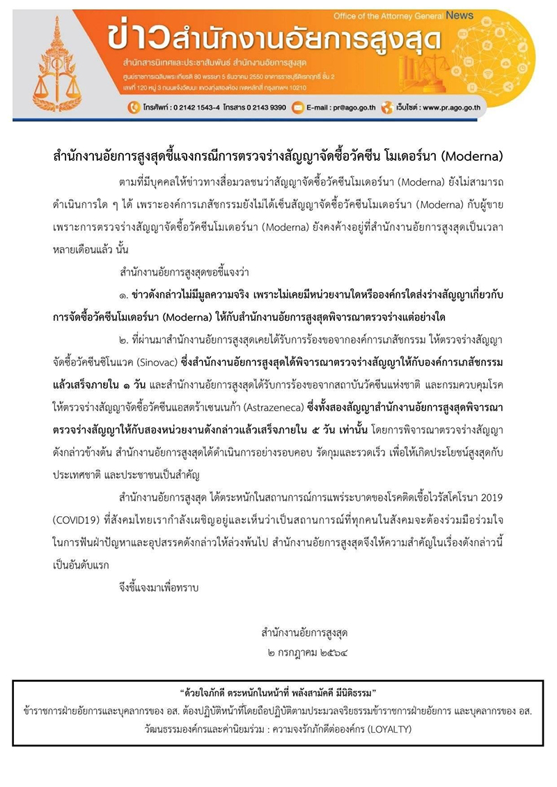 1.ข่าวดังกล่าวไม่มีมูลความจริง เพราะไม่เคยมีหน่วยงานใดหรือองค์กรใดส่งร่างสัญญาเกี่ยวกับการจัดซื้อวัคซีนโมเดอร์นา (Moderna) ให้กับสำนักงานอัยการสูงสุดพิจารณาตรวจร่างแต่อย่างใด