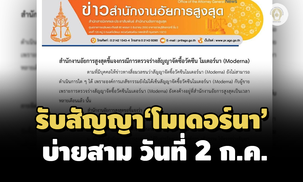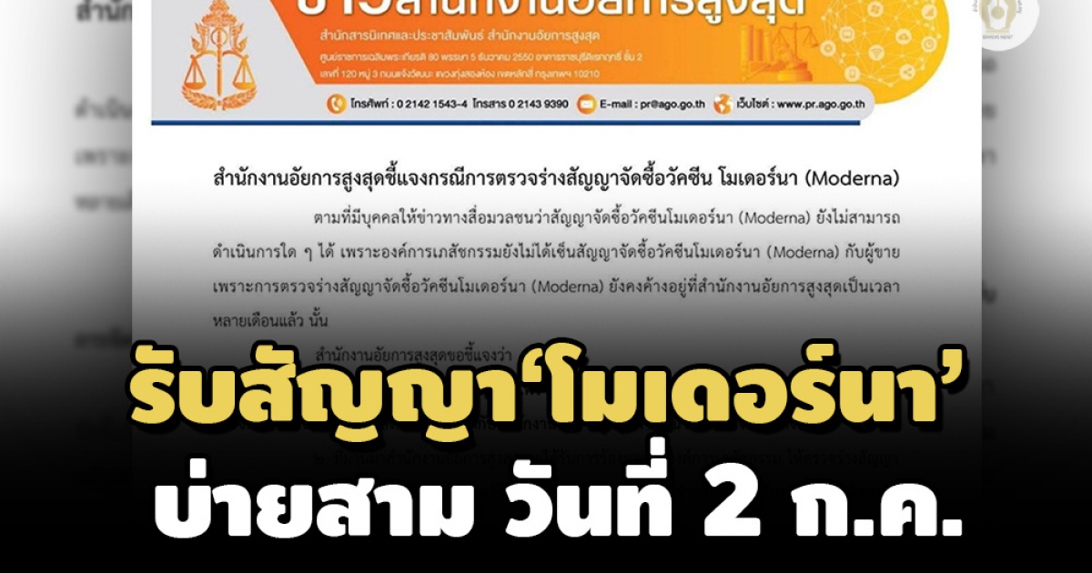 (ข่าวประกอบ : องค์การเภสัชกรรมเผยส่งร่างสัญญาซื้อวัคซีน'โมเดอร์นา'ให้อัยการสูงสุดแล้ว)