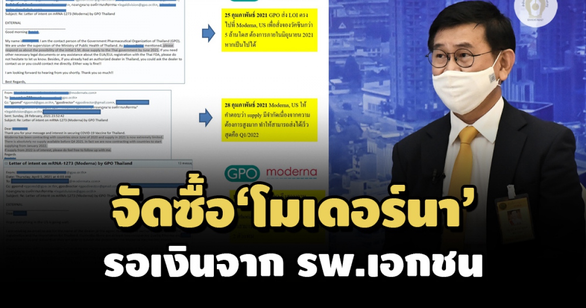 วันที่ 28 ก.พ.2564 บริษัทโมเดอร์นา สหรัฐอเมริกา ตอบกลับมาว่า การผลิตมีจำกัดเนื่องจากความต้องการสูงมาก ทำให้สามารถส่งได้เร็วที่สุดคือไตรมาส 1 ของปี 2565