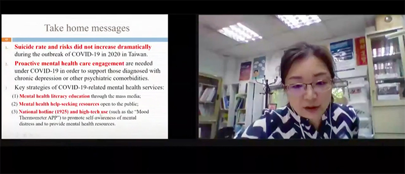 สำหรับปัญหาทางสุขภาพจิตของไต้หวันนั้น รศ.เทียนนี วู คณะแพทยศาสตร์ มหาวิทยาลัยแห่งชาติของประเทศไต้หวัน กล่าวว่า ในช่วงการระบาดของโควิด ปี 2563 ไต้หวันพบความเสี่ยงและอัตราการฆ่าตัวตายเพิ่มขึ้นเล็กน้อย โดยมีผู้ฆ่าตัวตายในช่วงวิกฤติโควิด อยู่ที่ 11 คนต่อประชากรแสนคน ส่วนสาเหตุที่เพิ่มขึ้นเพียงเล็กน้อยแตก เนื่องจากเรามีศูนย์เฝ้าระวังการฆ่าตัวตายแห่งชาติ ที่มีการรวบรวมสถิติ ข้อมูลพื้นฐานของผู้ฆ่าตัวอย่างแห่งชาติเป็นประจำทุกปี เพื่อนำข้อมูลเหล่านั้นไปปรับใช้เป็นกลยุทธ์ในการป้องกันการฆ่าตัวตายที่ตอบโจทย์มากขึ้น