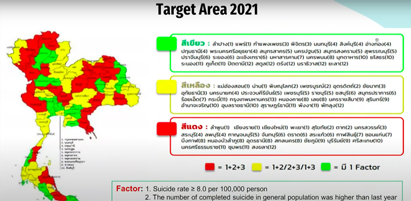 (ภาพ: การแบ่งโซนสีตามความรุนแรงของสถานการณ์การฆ่าตัวตายในประเทศไทย)