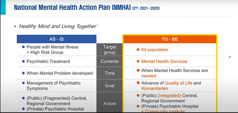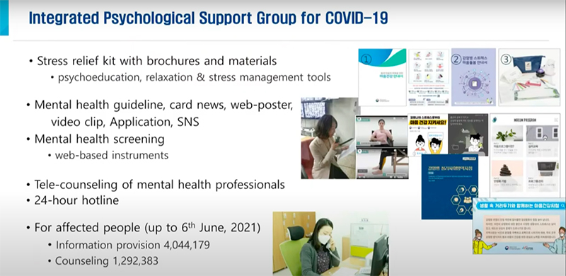 ดร.มินบิ ลี ศูนย์สุขภาพจิต ประเทศเกาหลีใต้ กล่าวว่า หลังจากประสบปัญหาการระบาดระลอกใหญ่ประเทศเกาหลีใต้ เราได้ประสบกับปัญหาซึมเศร้า และการฆ่าตัวตายที่เพิ่มขึ้น ขณะเดียวกัน ในปี 2563 ก็พบว่าชาวเกาหลีใต้มีความต้องการที่จะปรึกษาสุขภาพจิตมากขึ้นถึง 20% จากเดิมที่มีเพียง 3%