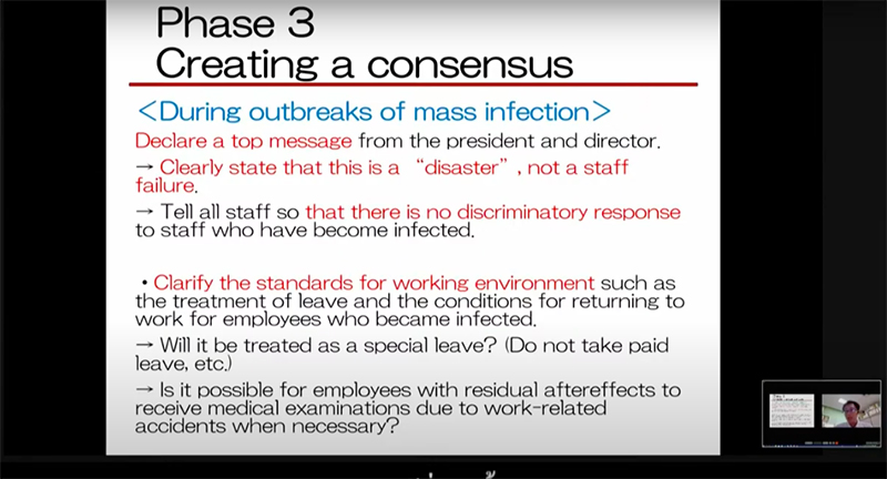 จากการวิเคราะห์ผลสำรวจ เพื่อบรรลุฉันทามติ ดร.ชิโรชิกะ จึงให้ข้อเสนอว่า ผู้นำควรจะประกาศอย่างเป็นทางการว่านี่เป็นวิกฤติที่ไม่ใช่ความผิดพลาดของแพทย์ พร้อมขจัดการเลือกปฏิบัติต่อผู้ติดเชื้อ รวมถึงแพทย์ที่ติดเชื้อหรือปฏิบัติหน้าที่ใกล้ชิดกับผู้ติดเชื้อด้วย นอกจากนั้นหัวหน้าแผนกต่างๆควรจะแสดงถึงความห่วงใยโดยอาจโทรหาเจ้าหน้าที่ที่ติดเชื้ออยู่ตลอด และเมื่อเขารักษาหายแล้ว กลับมาปฏิบัติหน้าที่ต่อ อยากให้ขอบคุณเขา รวมถึงอยากให้มีการจ่ายค่าจ้างพิเศษเพิ่มขึ้นเพื่อเป็นการตอบแทนในภาระหน้าที่อันหนักหน่วงท่ามกลางการระบาดของโควิดด้วย