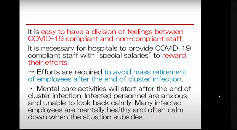 ดร.ชิโรชิกะ กล่าวอีกว่า หลังจากได้พูดคุยกัน เราพบว่าความเครียดของบุคลากรแพทย์มีสาเหตุมาจาก ความกังวลต่อการติดเชื้อ การไม่ได้รับการพักผ่อนอย่างเพียงพอ การขาดอิสรภาพในการใช้ชีวิตของตนเอง เช่น การไม่สามารถกินอาหารร่วมกับครอบครัว หรือติดต่อกับบุคคลภายนอกได้ รวมถึงการถูกเลือกปฏิบัติเหมือนเชื้อโรค เพราะทำงานใกล้ชิดกับผู้ป่วย และมีหลายคนติดเชื้อจากการดูแลผู้ป่วย ขณะเดียวกันก็รู้สึกการได้รับการปฏิบัติที่ไม่เท่าเทียมกัน โดยรู้สึกว่าตัวเองปฏิบัติตามมาตรการควบคุมโรคที่เคร่งครัดมาก แต่ในทางกลับกันบุคคลทั่วไปไม่ค่อยให้ความร่วมมือเท่าไร จึงเครียดมาก