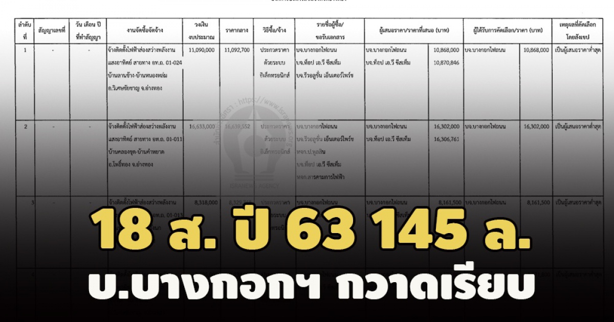 ทั่วปท. 287 โครงการ 1,361 ล.! บ.บางกอกไฟฯ คว้างานเสาไฟรัฐ- อบต.ราชาเทวะ มากสุด 907 ล.