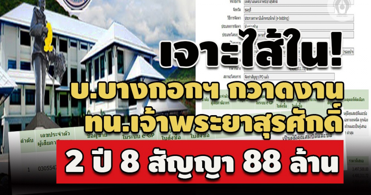 "...จากการตรวจสอบข้อมูลภาพรวมการจัดซื้อจัดจ้างโครงการ เสาไฟฟ้าส่องสว่างพลังงานแสงอาทิตย์ ของ เทศบาลนครเจ้าพระยาสุรศักดิ์ (ทน.เจ้าพระยาสุรศักดิ์) ที่ปรากฏชื่อ บริษัท บางกอกไฟถนน จำกัด เข้ามาเป็นคู่สัญญารับงาน แยกเป็นปี 2562 จำนวน 4 สัญญา วงเงิน 45,243,567 บาท ปี 2563 จำนวน 4 สัญญา วงเงิน 43,250,000 บาท รวมวงเงินทั้งสิ้น 88,493,567 บาท..."