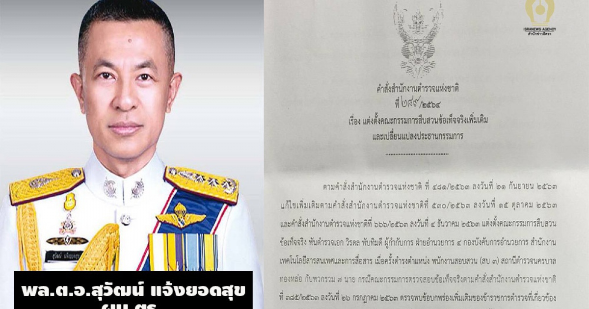 เผยคำสั่ง พล.ต.อ.สุวัฒน์ แจ้งยอดสุข ผบ.ตร. เปลี่ยนตัว ปธ.สอบคดีบอส อยู่วิทยา ใหม่ ให้ พล.ต.อ. วิสนุ ปราสาททองโอสถ จเรตำรวจแห่งชาติ ทำหน้าแทน พล.ต.ท. เชษฐา โกมลวรรธนะ เหตุต้องมีการสืบสวนนายตำรวจระดับสูงเพิ่ม มีชื่อ พลตำรวจเอก มนู เมฆหมอก ด้วย ประธานฯ จึงต้องเป็นขรก.ตำรวจชั้นสัญญาบัตรมีตำแหน่ง-ยศไม่ต่ำกว่าผู้ถูกกล่าวหา