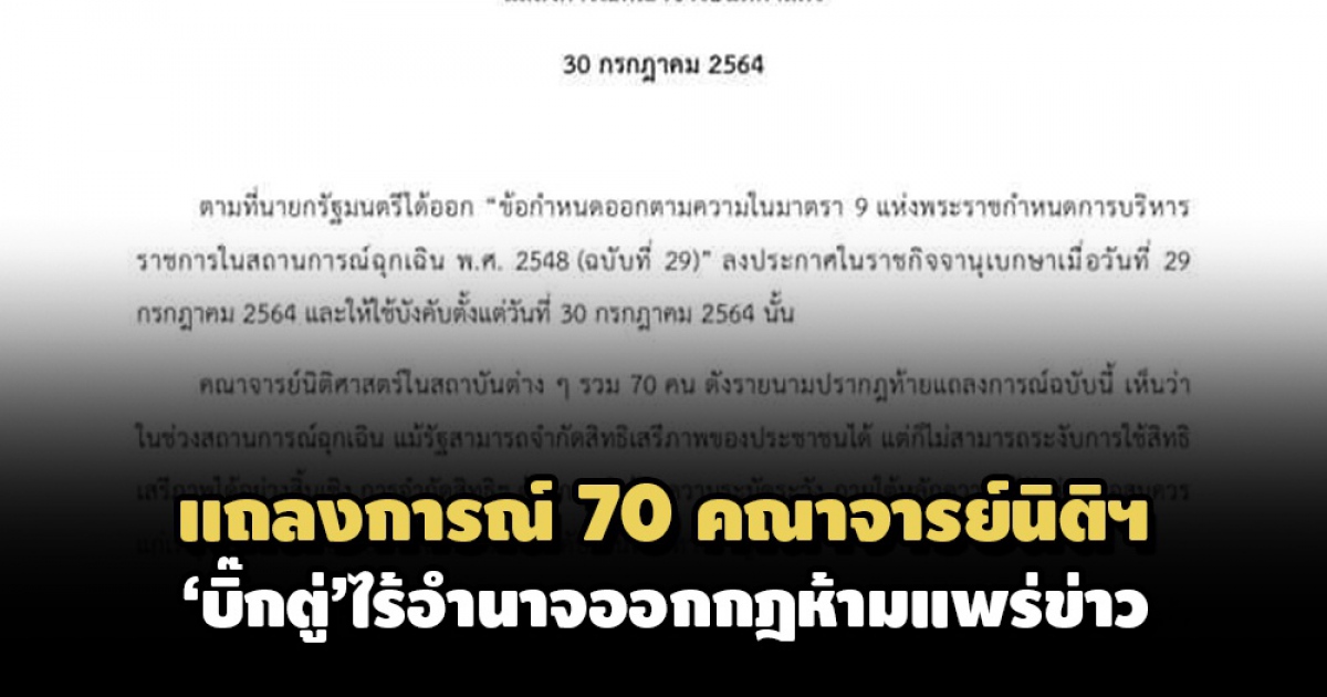 หมายเหตุ (สำนักข่าวอิศรา www.isranews.org) : เมื่อวันที่ 30 ก.ค. 2564 คณาจารย์คณะนิติศาสตร์ จากมหาวิทยาลัยทั่วประเทศ ออกแถลงการณ์คณาจารย์นิติศาสตร์ ถึงกรณีพล.อ.ประยุทธ์ จันทร์โอชา นายกรัฐมนตรีได้ออก “ข้อกำหนดออกตามความในมาตรา 9 แห่งพระราชกำหนดการบริหารราชการในสถานการณ์ฉุกเฉิน พ.ศ. 2548 (ฉบับที่ 29)” ลงประกาศในราชกิจจานุเบกษาเมื่อวันที่ 29 กรกฎาคม 2564 และให้ใช้บังคับตั้งแต่วันที่ 30 กรกฎาคม 2564