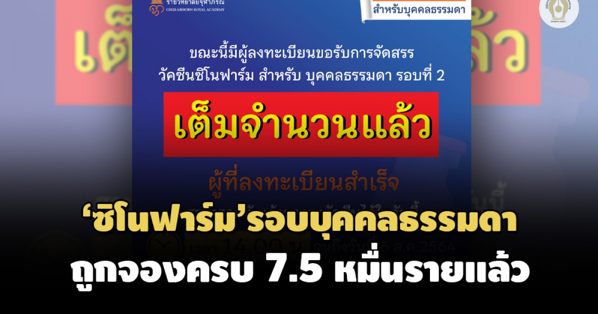 • ราชวิทยาลัยจุฬาภรณ์เผย'ซิโนฟาร์ม'รอบบุคคลธรรมดา ถูกจองครบ 7.5 หมื่นรายแล้ว