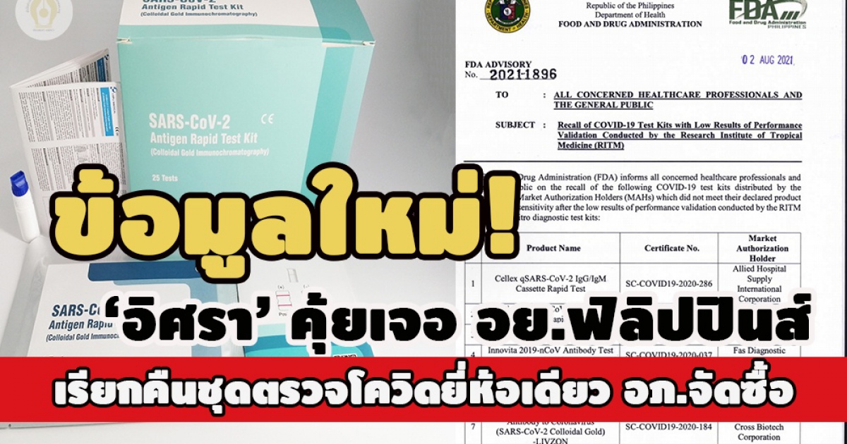 "...เมื่อวันที่ 2 ส.ค.ที่ผ่านมา สำนักงานคณะกรรมการอาหารและยาแห่งประเทศฟิลิปปินส์ได้ออกประกาศแจ้งไปยังบุคลากรทางการแพทย์และสาธารณชนที่มีความกังวลเกี่ยวกับการเรียกคืนชุดตรวจโควิด-19 ซึ่งถูกแจกจ่ายโดยหน่วยงานซึ่งทำหน้าที่อนุญาตในด้านการตลาดของประเทศฟิลิปปินส์หรือว่า MAHs ด้วยเหตุผลว่า ชุดตรวจโควิด-19 ดังกล่าวนี้ไม่สามารถทำได้ตามสรรพคุณที่ประกาศเอาไว้ ดังนั้น ทางสำนักงานคณะกรรมการอาหารและยาแห่งประเทศฟิลิปปินส์ จึงได้มีการเรียกคืนชุดตรวจโควิด-19 ที่มีปัญหาแล้ว..."