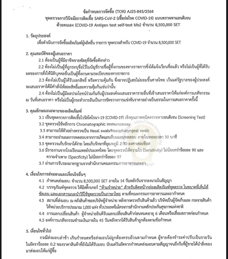 ขณะที่ สปสช. มีหนังสือแจ้งรพ.ราชวิถี ที่ สปสช. 6.70/15845 ลงวันที่ 1 สค.64 ปรับข้อกําหนดการจัดซื้อชุดตรวจฯ พร้อมแนบข้อกําหนดฉบับที่แก้ไขแล้ว