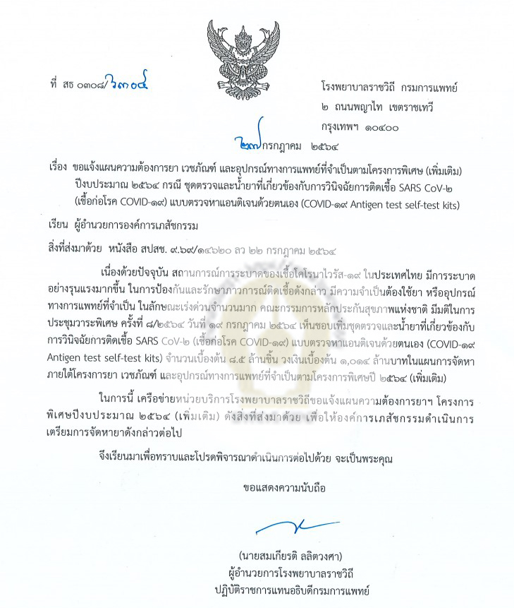 ต่อมา โรงพยาบาลราชวิถี ได้มีหนังสือถึงองค์การเภสัชกรรม ที่ สธ 0308/6468 ลงวันที่ 2 ส.ค.64 แจ้งเรื่องสปสช.แจ้ง ปรับข้อกําหนดชุดตรวจฯ ดังกล่าว
