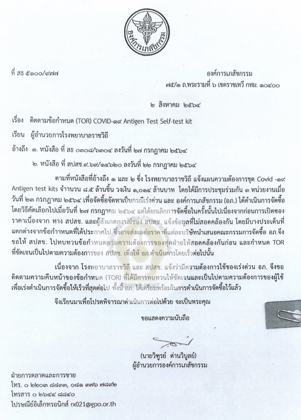 หลังจากนั้น องค์การเภสัชกรรม ได้มีหนังสือ ที่ สธ 5100/977 ลงวันที่ 2 ส.ค.64 ถึงโรงพยาบาลราชวิถี ติดตามข้อกําหนด (TOR) เนื่องจากทาง รพ.ราชวิถี และ สปสช. แจ้งว่ามีความต้องการเร่งด่วน จึงขอติดตาม TOR ที่มีการทบทวน