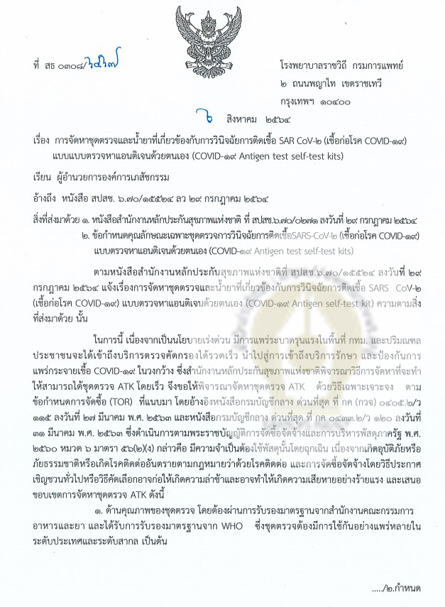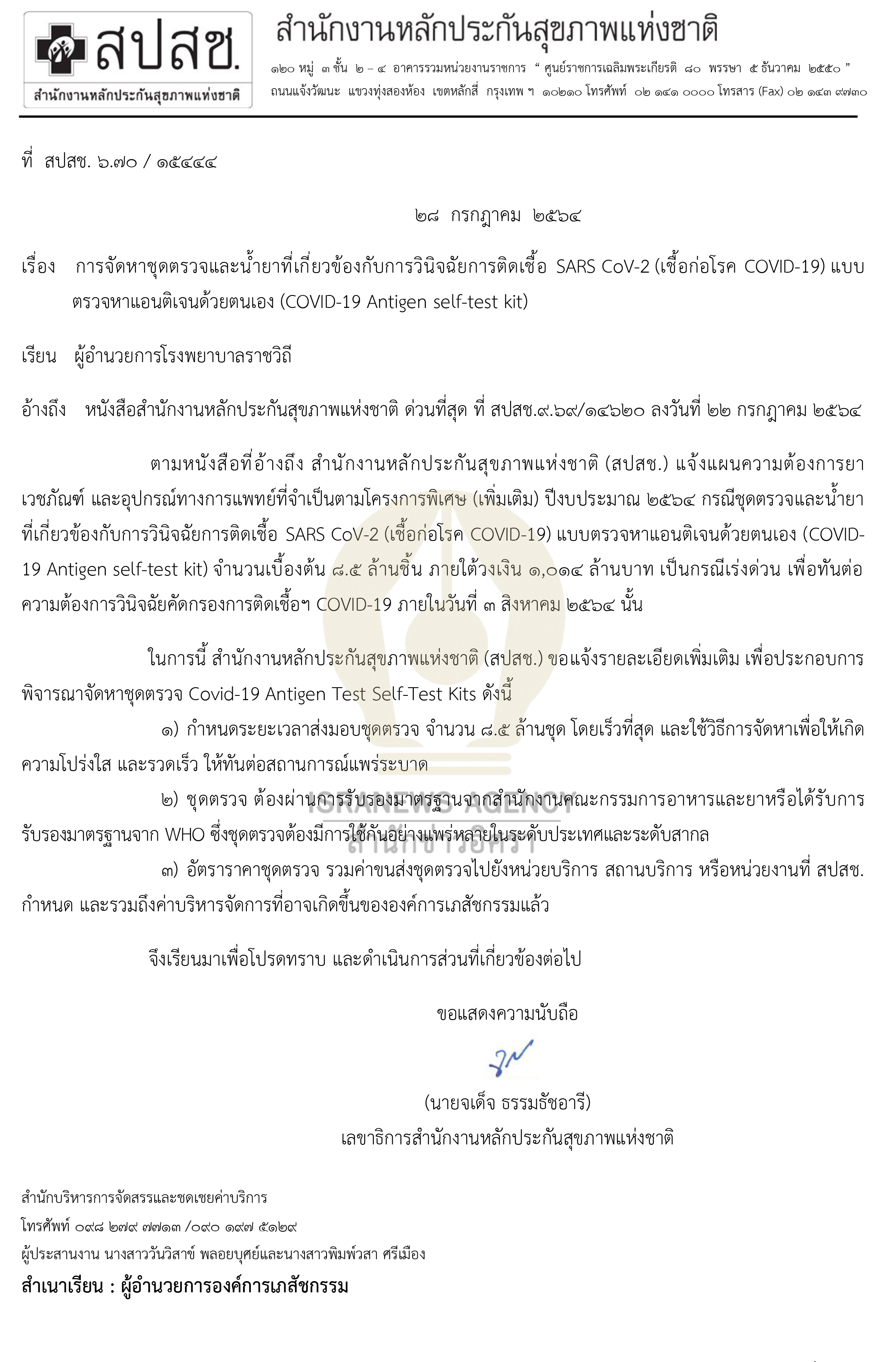 เนื้อหาสาระสำคัญระบุว่า เนื่องด้วยปัจจุบัน สถานการณ์การระบาดของเชื้อโคโรนาไวรัส-19 ในประเทศ มีการระบาดอย่างรุนแรงมากขึ้น ในการป้องกันและรักษาภาวการณ์ติดเชื้อดังกล่าว มีความจําเป็นต้องใช้ยา หรืออุปกรณ์ทาง การแพทย์ที่จําเป็น ในลักษณะเร่งด่วนจํานวนมาก คณะกรรมการหลักประกันสุขภาพแห่งชาติ มีมติในการประชุมวาระพิเศษ ครั้งที่ 8/2564 วันที่ 19 กรกฎาคม 2564 เห็นชอบเพิ่มชุดตรวจและน้ำยาที่เกี่ยวข้องกับการวินิจฉัย การติดเชื้อ SARS CoV-2 (เชื้อก่อโรค COVID-19) แบบตรวจหาแอนติเจนด้วยตนเอง (COVID-19 Antigen test self-test Kits) วงเงินเบื้องต้น 1,014 ล้านบาท ในแผนการจัดหาภายใต้โครงการยา เวชภัณฑ์ และอุปกรณ์ทางการ แพทย์ที่จําเป็นตามโครงการพิเศษปี 2564 โดยให้เครือข่ายหน่วยบริการด้านยาและเวชภัณฑ์ (เครือข่าย โรงพยาบาลราชวิถี) ดําเนินการจัดหาเพื่อสนับสนุนชุดตรวจให้แก่หน่วยบริการในเครือข่ายและประชาชน ต่อไป