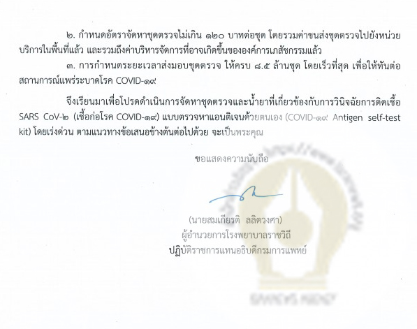 สปสช. ยังระบุด้วยว่า อนึ่ง จากความเห็นดังกล่าวข้างต้นเป็นความเห็นประกอบในการพิจารณาในการกำหนด การจัดซื้อชุดตรวจ Antigen self-test kits สปสช. ขอเสนอว่าการที่โรงพยาบาลราชวิถี และ/หรือ องค์การเภสัชกรรมจะพิจารณาแก้ไขเพิ่มเติม อย่างไรนั้น หากการดำเนินการเป็นไปตามกฎหมาย ข้อบังคับ ระเบียบ ประกาศ ในการจัดหาฯ รวมถึงได้คำนึงถึงความเร่งด่วนในการได้มาซึ่งชุดตรวจ เพื่อใช้ได้ทันต่อสถานการณ์แพร่ระบาดของโรคโควิด-19 แล้ว ขอให้โรงพยาบาลราชวิถี และ/หรือ องค์การเภสัชกรรมได้พิจารณา ตามอำนาจหน้าที่ และหรือตามที่เห็นสมควรและดำเนินการต่อไป