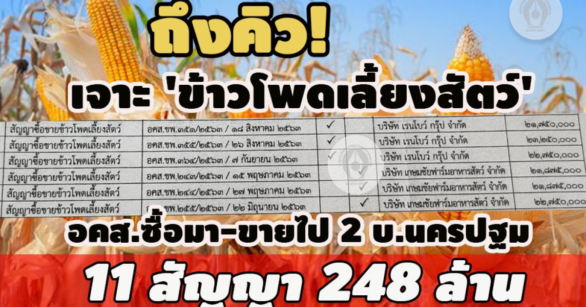 "...ในช่วงเดือนพฤษภาคม 2563 - กันยายน 2563 อคส.ได้ทำสัญญาซื้อสินค้าข้าวโพดเลี้ยงสัตว์ จากบริษัท เรนโบว์ กรุ๊ป จำกัด จำนวน 11 สัญญา รวมเป็นวงเงินจำนวน 246,175,000 บาท จากนั้นก็นำไปขายต่อให้กับ บริษัท เกษมชัยฟาร์มอาหารสัตว์ จำกัด โดยทำสัญญาขายจำนวน 11 สัญญา เท่ากัน รวมวงเงิน 248,925,000 บาท เท่ากับว่า อคส. มีต้นทุนในการจัดซื้อจำนวน 246,175,000 บาท บวกกำไรอีก 2,750,000 บาท หรือจะได้กำไรสัญญาละ 250,000 บาท ..."