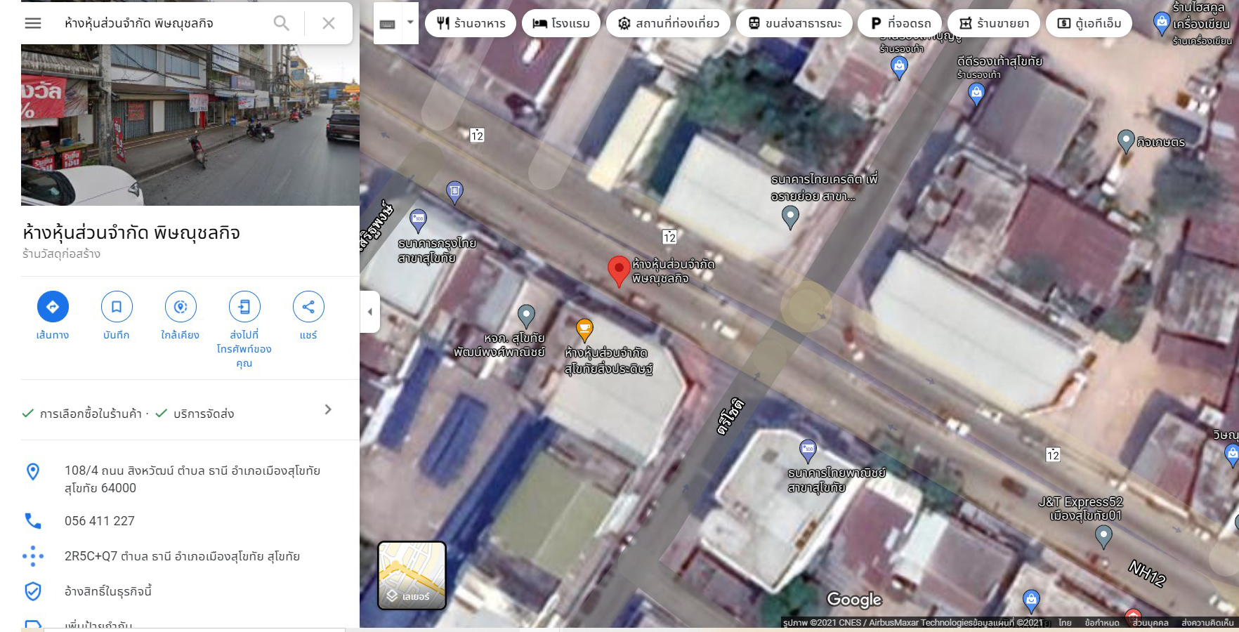 จากการตรวจสอบข้อมูลการจดทะเบียนจัดตั้ง ห้างหุ้นส่วนจำกัด พิษณุชลกิจ ที่แจ้งไว้ต่อกรมพัฒนาธุรกิจการค้า พบว่า จดทะเบียน 10 ตุลาคม 2527 ทุนปัจจุบัน 10,000,000 บาท ตั้งอยู่เลขที่ 340/7 หมู่ 9 ตำบลปากแคว อำเภอเมือง จังหวัดสุโขทัย