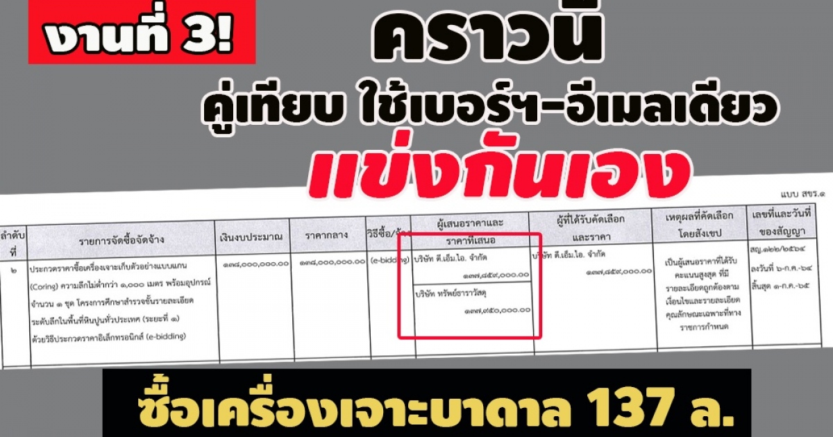 - พบสัญญาที่ 2 'กลุ่มสิทธิยนต์-คู่เทียบ' ใช้เบอร์ฯ-อีเมลเดียว แข่งงานพร้อมกัน ชนะแค่ 3 พัน