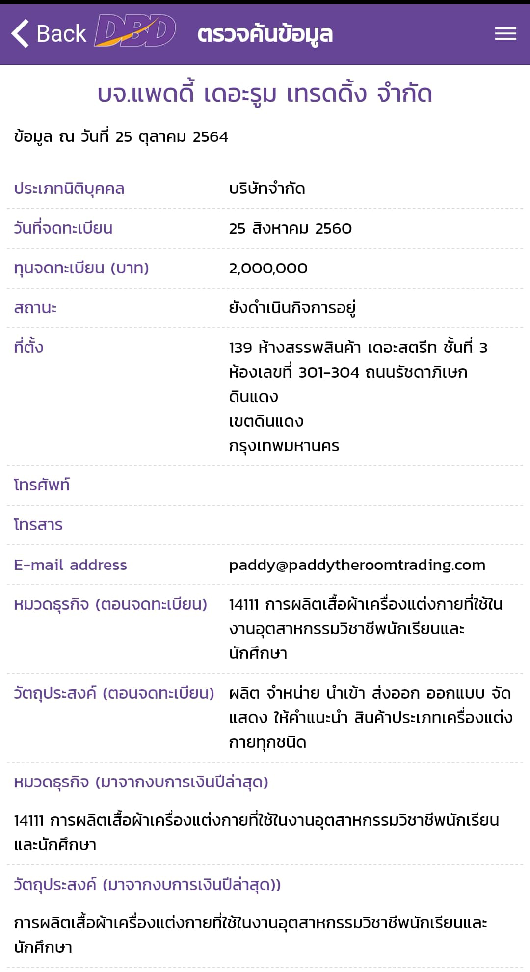 ขณะที่ สำนักข่าวอิศรา สืบค้นฐานข้อมูลกรมพัฒนาธุรกิจการค้า พบว่า มีบริษัทชื่อว่า แพดดี้ เดอะรูม เทรดดิ้ง จำกัด อยู่ จดทะเบียนจัดตั้ง 25 สิงหาคม 2560 ทุนปัจจุบัน 1 ล้านบาท ตั้งอยู่เลขที่ 139 อาคารเดอะสตรีท ชั้น 3 ห้อง 301-304 ถนนรัชดาภิเษก แขวงดินแดง เขตดินแดง จังหวัดกรุงเทพมหานคร