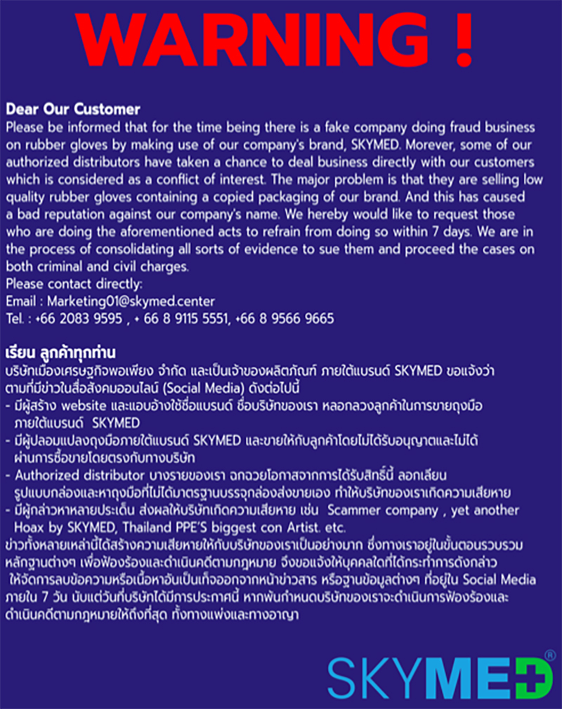 "SkyMed เป็นของปลอมแน่นอน บริษัทดังกล่าวมีใบอนุญาตนำเข้าถุงมือทางการแพทย์ที่ผลิตในเวียดนาม แต่บันทึกระบุว่า SkyMed ไม่เคยนำเข้าถุงมือทางการแพทย์มาประเทศไทย และบริษัทไม่ได้ผลิตถุงมือของตนเองด้วย"