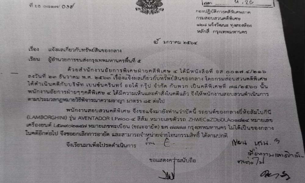 พนักงานสอบสวน จึงขอแจ้งมายังท่านว่า บัดนี้รถยนต์ของกลางยี่ห้อลัมโบกินี(LOMBORGHINI) รุ่น AVENTADOR LP 700-4 สีส้ม หมายเลขตัวถังรถ ZHWEC1ZD6DLA01824 หมายเลขเครื่องยต์ L 53902147 หมายเลขทะเบียน (ขณะอายัด) ฆค 7777 กรุงเทพมหานคร ไม่ได้เป็นของกลางในคดีอีกต่อไป จึงขอยกเลิกการอายัด และสามารถจำหน่ายจ่ายโอนกรรมสิทธิ์ได้ตามปกติ จึงเรียนมาเพื่อดำเนินการ” (ดูเอกสาร)
