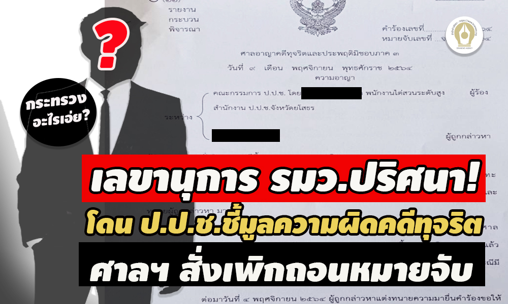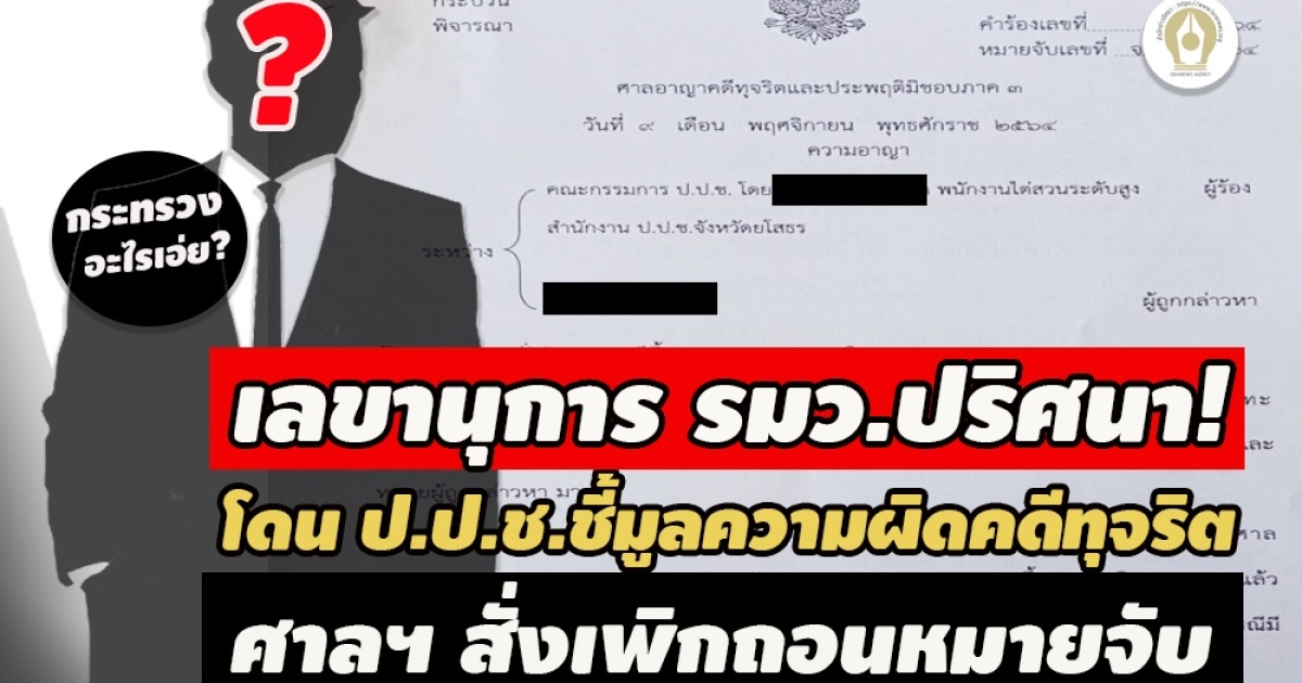 ขณะที่แหล่งข่าวจาก สำนักงาน ป.ป.ช. ให้ข้อมูลยืนยันสำนักข่าวอิศรา ว่า เกี่ยวกับคดีนี้ เมื่อวันที่ 25 ก.ค.2564 ศาลอาญาคดีทุจริตและประพฤติมิชอบภาค 3 ได้อนุมัติออกหมาบจับเลขานุการ รมว. รายนี้ ตามข้อกล่าวหาของ คณะกรรมการ ป.ป.ช. ที่ระบุว่ากระทำความผิดฐานเป็นพนักงาน มีหน้าที่ซื้อ ทำ จัดการหรือรักษาทรัพย์ใด ๆ ใช้อำนาจตำแหน่งหน้าที่โดยทุจริต อันเป็นการเสียหายแก่รัฐ เทศบาล สุขาภิบาลหรือเจ้าของทรัพย์นั้น ฐานเป็นเจ้าพนักงาน มีหน้าที่จัดการหรือดูแลกิจการใดเข้ามีส่วนได้เสียเพื่อประโยชน์สำหรับตนเอง หรือผู้อื่นเนื่องด้วยกิจการนั้น และฐานเป็นเจ้าพนักงาน ปฏิบัติหรือละเว้นการปฏิบัติหน้าที่โดยมิชอบ เพื่อให้เกิดความเสียหายแก่ผู้หนึ่งผู้ใด หรือปฏิบัติหรือละเว้นการปฏิบัติหน้าที่โดยทุจริต ตามประมวลกฎหมายอาญา มาตรา 151 , 152 , 157 ประกอบมาตรา 91