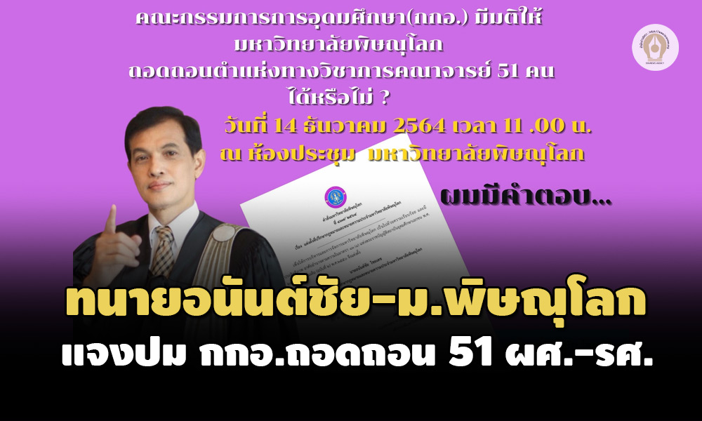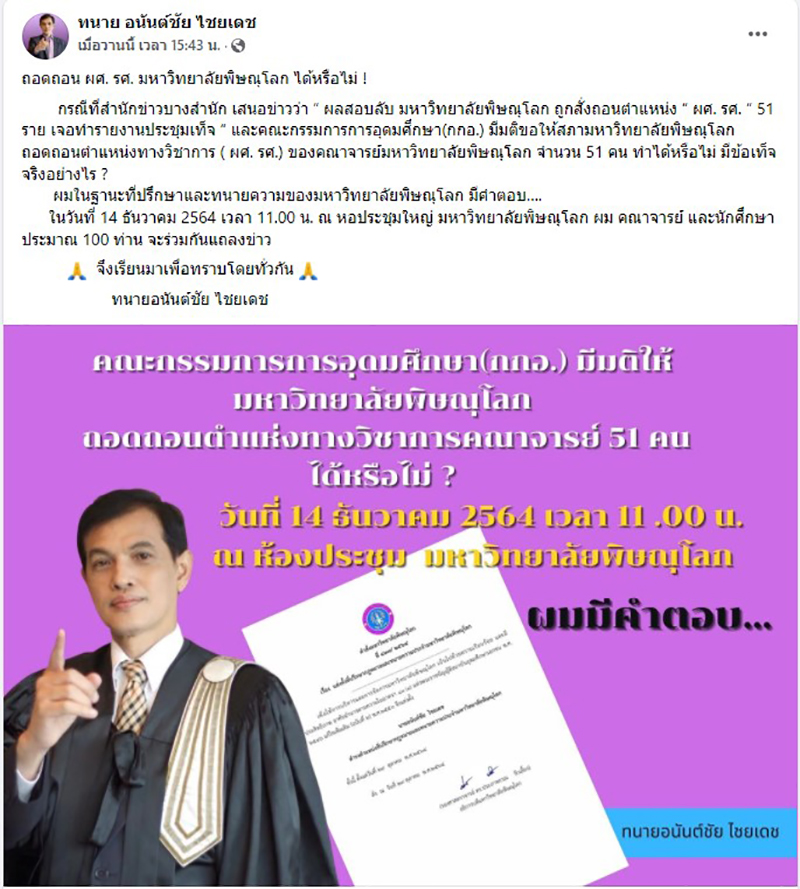 ผู้สื่อข่าวรายงานว่า เมื่อวันที่ 13 ธ.ค. 2564 นายอนันต์ชัย ไชยเดช ในฐานะที่ปรึกษาและทนายความของมหาวิทยาลัยพิษณุโลก โพสต์ข้อความผ่านเพจเฟซบุ๊ก ทนาย อนันต์ชัย ไชยเดช แจ้งงานแถลงร่วมกับคณาจารย์ ผู้ทรงคุณวุฒิ นักศึกษา ม.พิษณุโลก ประมาณกว่า 100 ราย กรณีที่มีข่าวว่า คณะกรรมการอุดมศึกษา (กกอ.) มีมติขอให้สภามหาวิทยาลัยพิษณุโลก ถอดถอนตำแหน่งทางวิชาการ (ผศ. รศ.) ของคณาจารย์มหาวิทยาลัยพิษณุโลก จำนวน 51 ราย ณ ห้องประชุม ม.พิษณุโลก ในวันที่ 14 ธ.ค. 2564 เวลา 11.00 น.