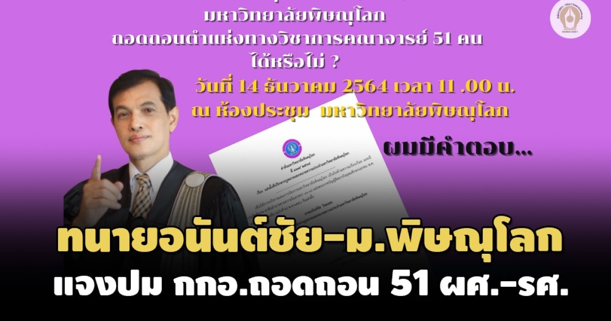 ทนายอนันต์ชัย ไชยเดช จัดแถลงข่าวร่วมกับคณาจารย์ ม.พิษณุโลก ราว 100 ราย กรณีการถอดถอนตำแหน่งทางวิชาการ (ผศ. รศ.) จำนวน 51 ราย ในวันพรุ่งนี้ เวลา 11.00 น.