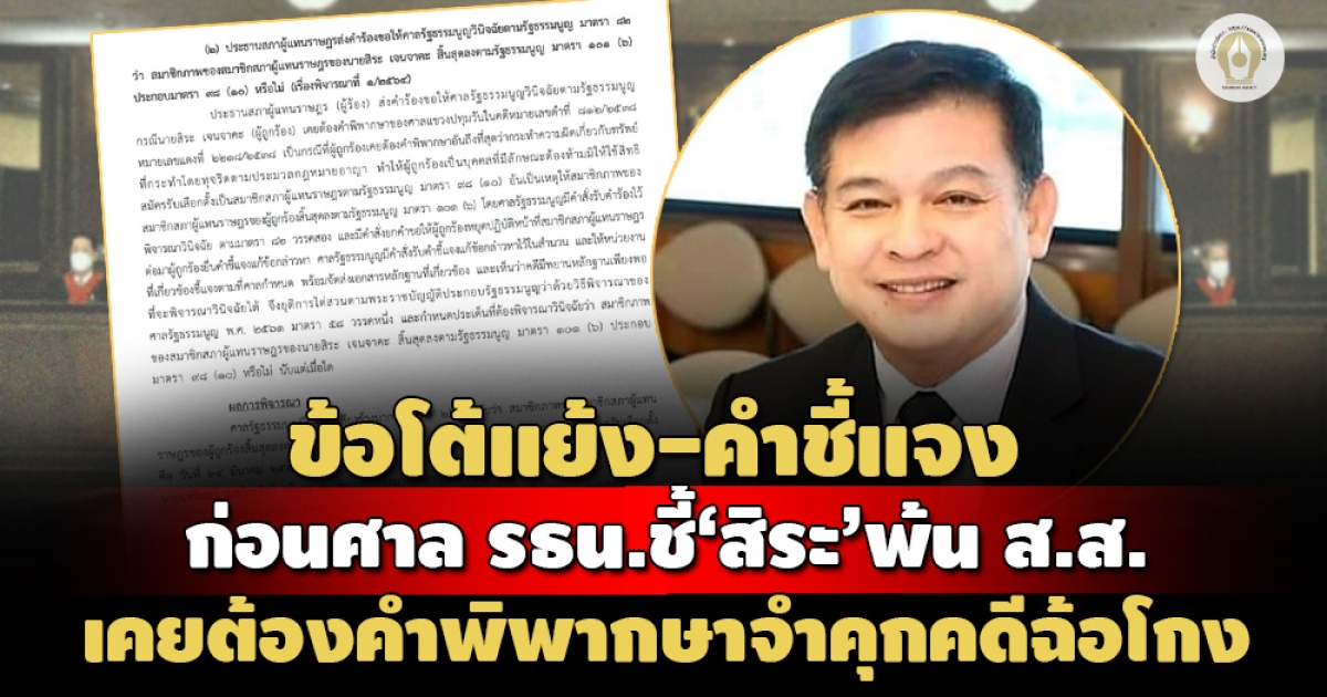 ข้อเท็จจริงรับฟังได้ว่าเมื่อวันที่ 21 พ.ย. 2538 นายสิระเคยต้องคำพิพากษาศาลแขวงปทุมวัน ว่ากระทำความผิดฐานฉ้อโกง เป็นความผิดเกี่ยวกับทรัพย์ ซึ่งกระทำโดยทุจริต ตามประมวลกฎหมายอาญา คดีดังกล่าวไม่มีการอุทธรณ์ต่อศาลอุทธรณ์