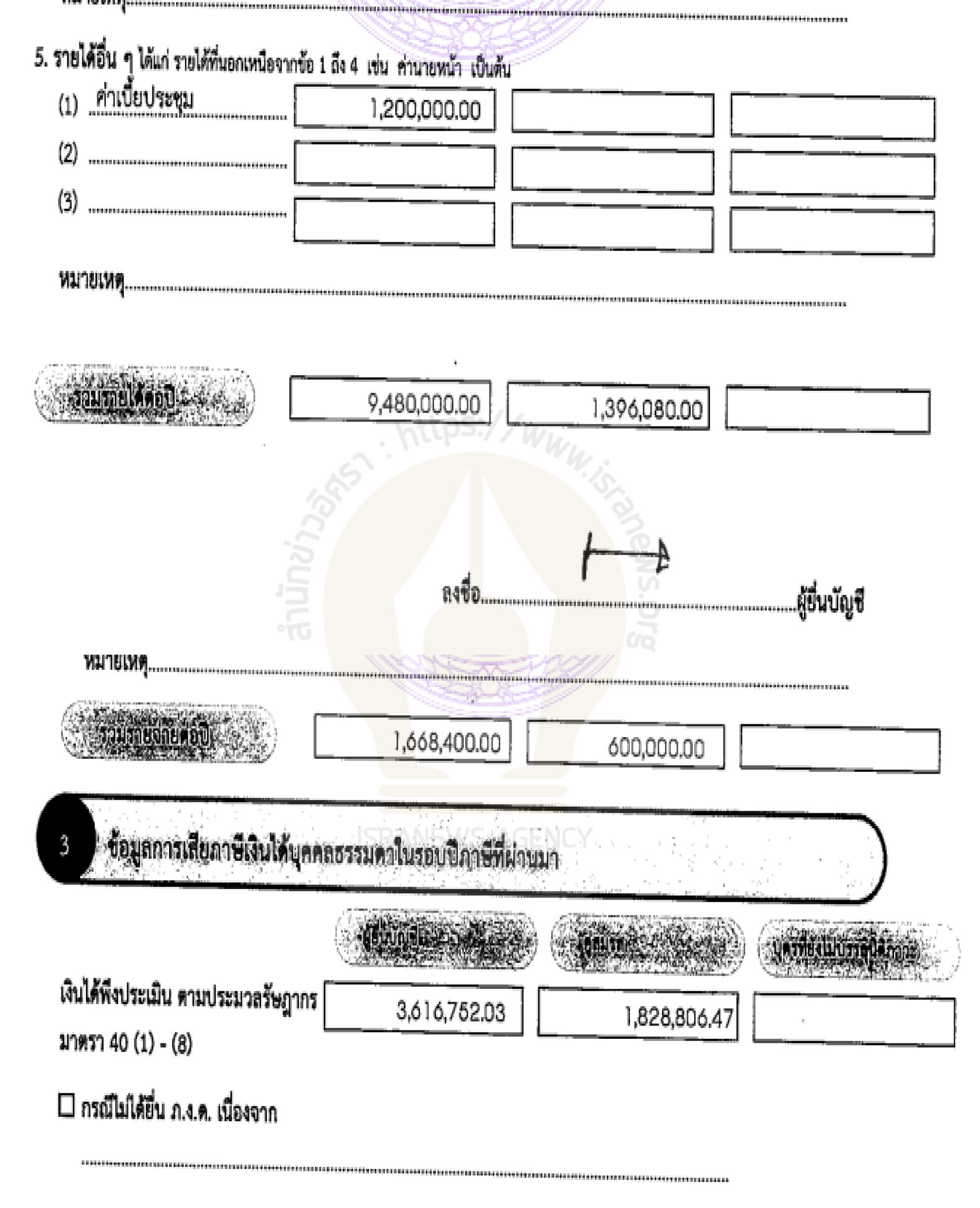 ข้อมูลการเสียภาษีเงินได้รอบปีภาษีที่ผ่านมา เงินได้พึงประเมิน ตามประมวลรัษฎากร มาตรา 40 (1)-(8) 3,616,752.03 บาท คู่สมรส เงินได้ฯ 1,828,806.47 บาท