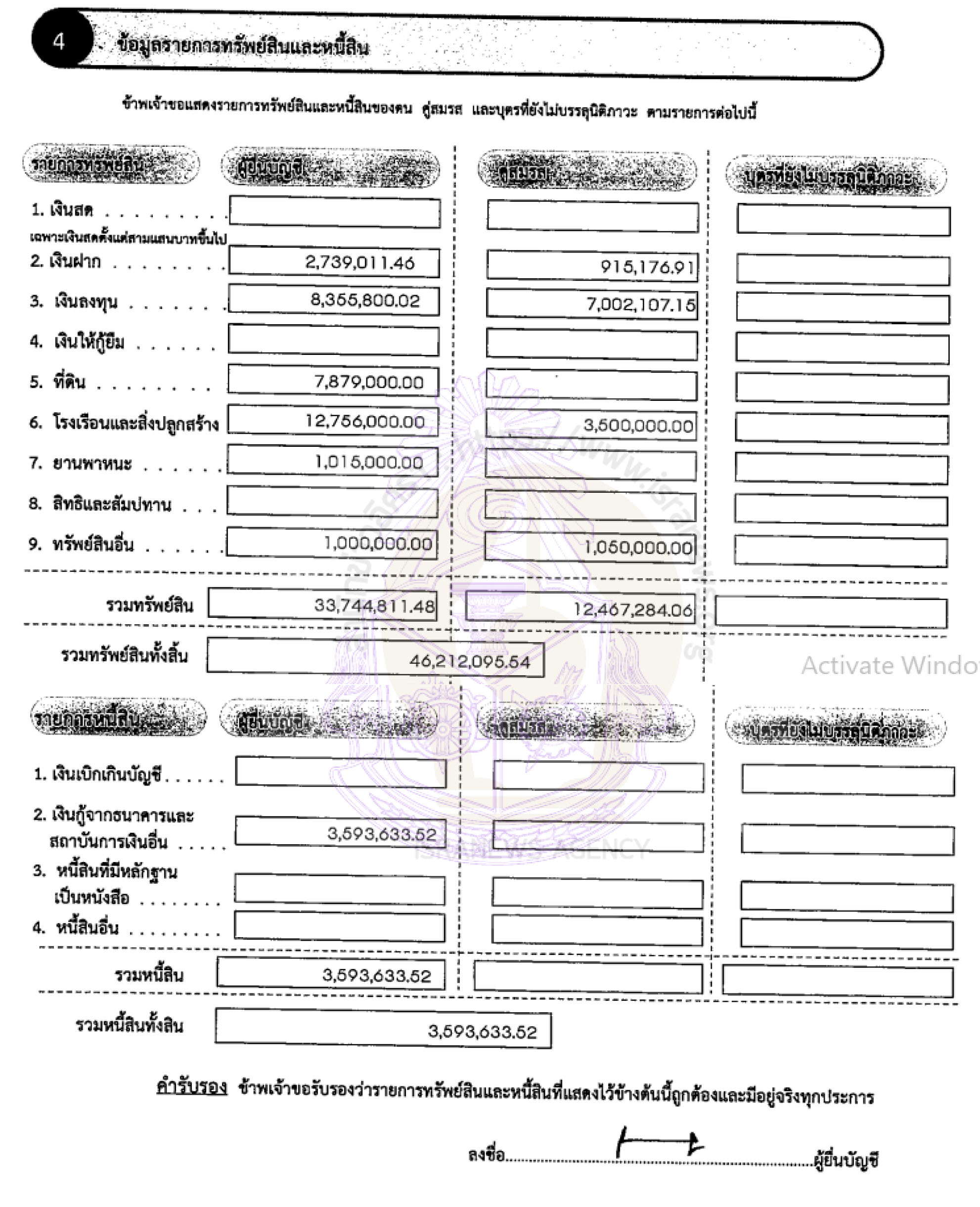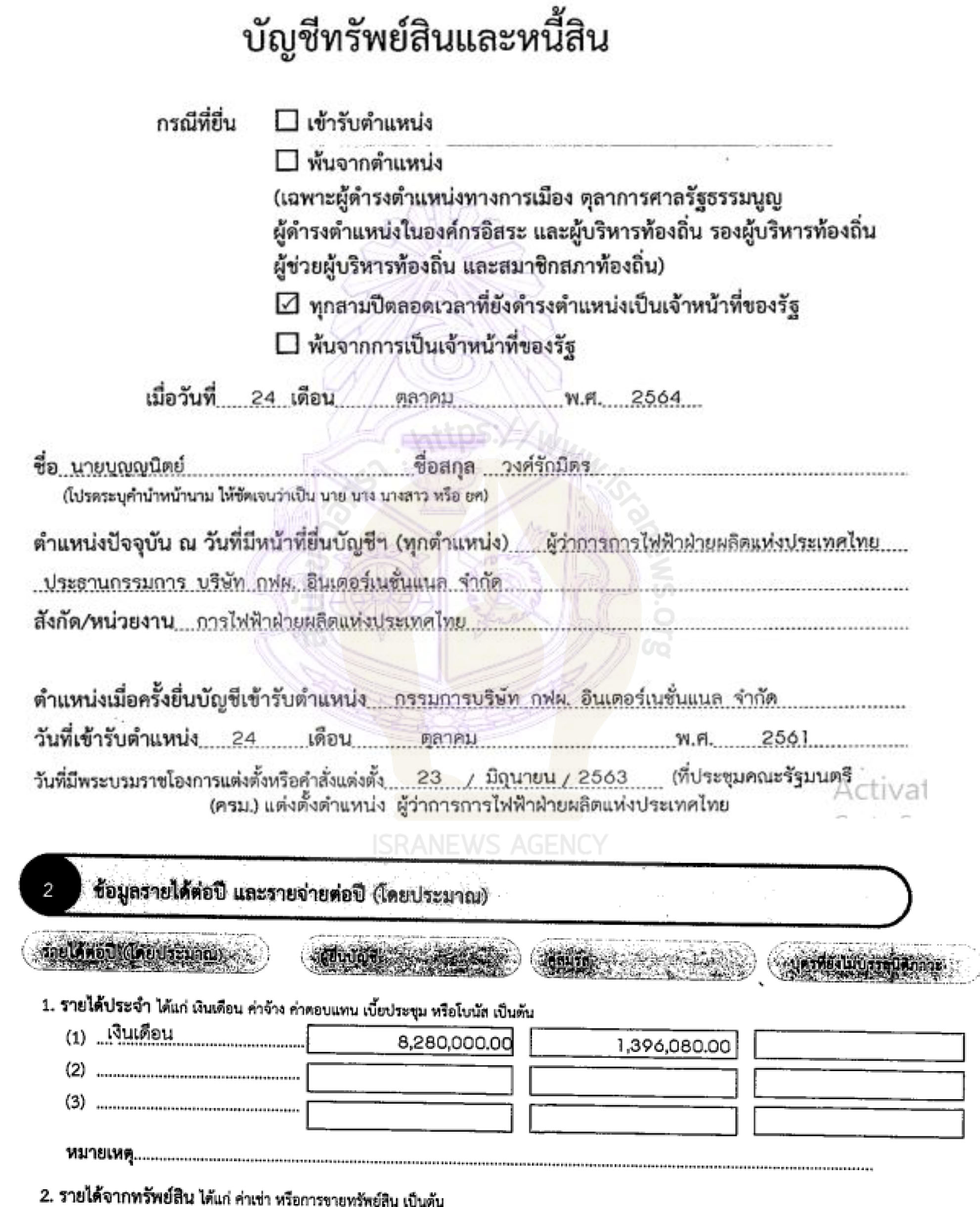 รายได้ 9,480,000 บาท (รายได้ประจำ เงินเดือน 8,280,000 บาท รายได้อื่นๆ เบี้ยประชุม 1,200,000 บาท) คู่สมรส 1,396,000 บาท ( รายได้ประจำ เงินเดือน 8,280,000 บาท ) รายจ่าย 1,668,400 บาท คู่สมรส 600,000 บาท