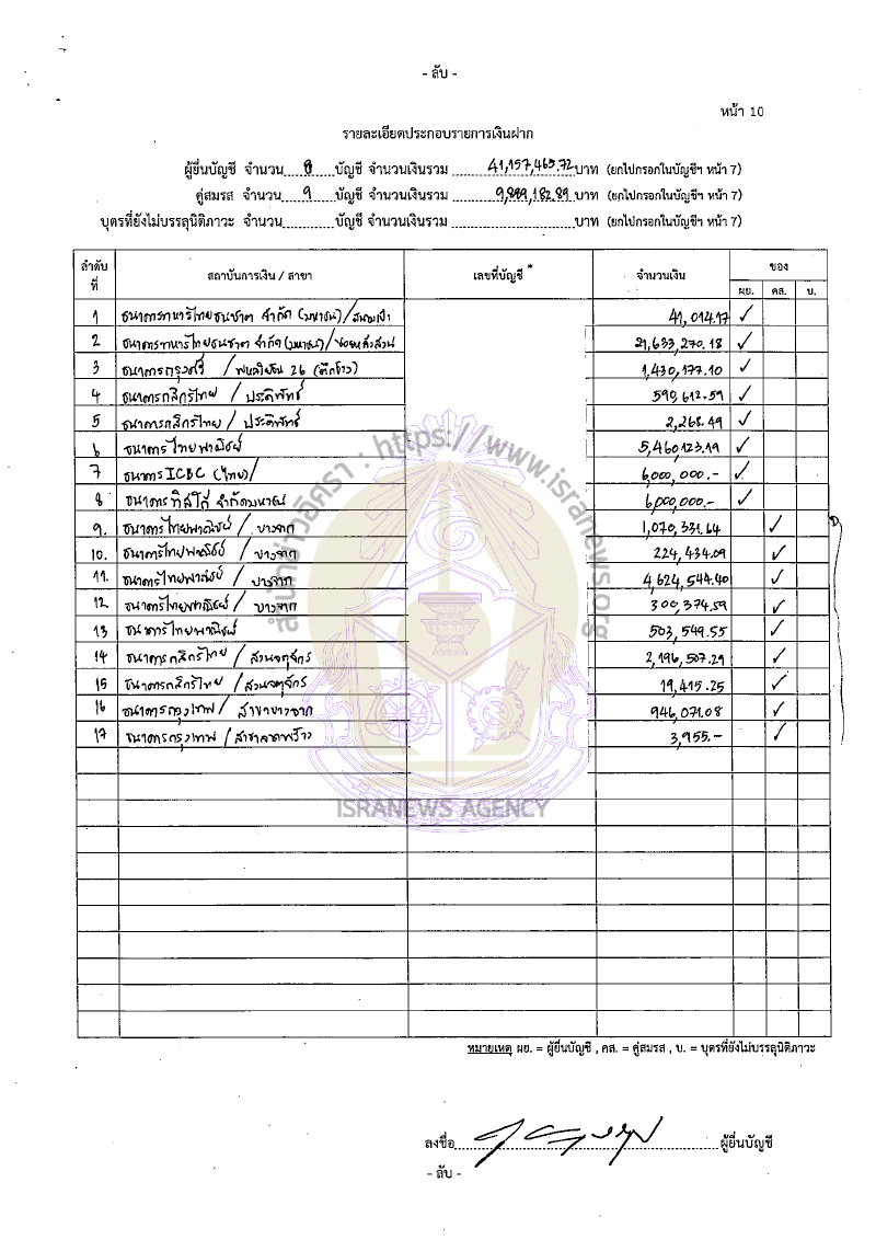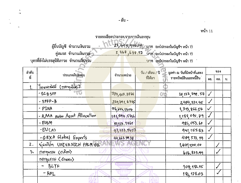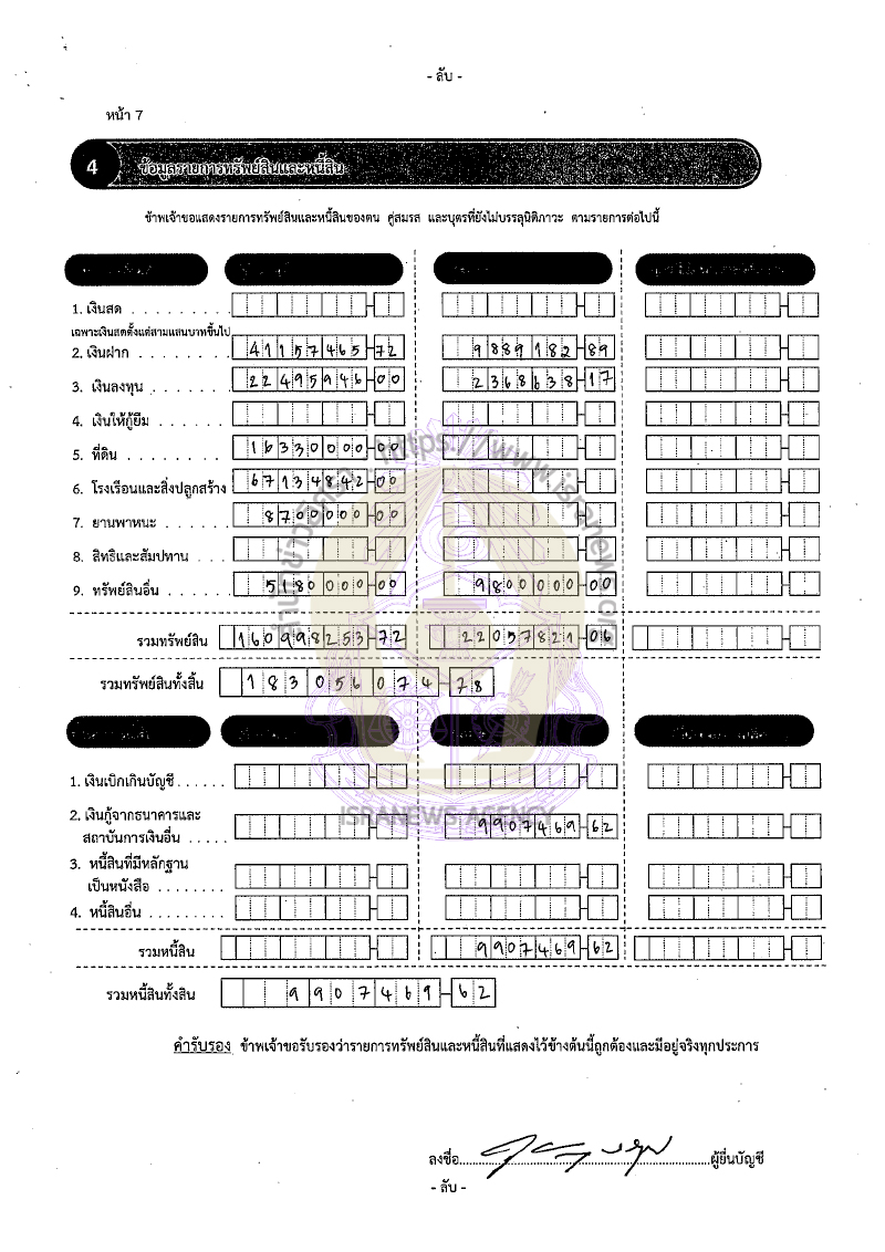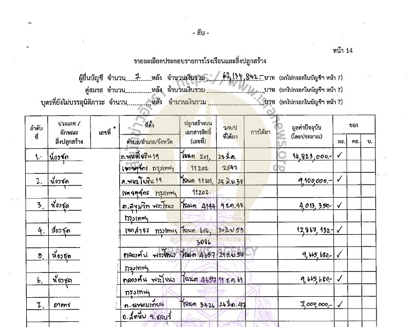 รวมทรัพย์สินทั้งสิ้น 183,056,074.78 บาท (เงินฝาก รวม 17 บัญชี 51,046,648.61 บาท ห้องชุด-อาคาร 7 หลัง 67,134,842) หนี้สิน 9,907,469.62 บาท