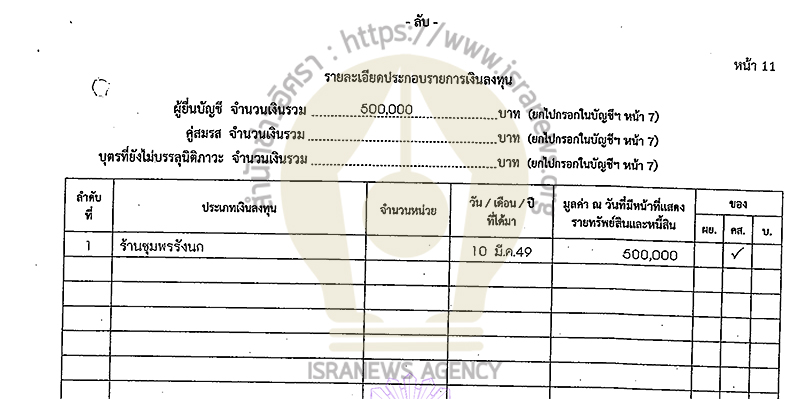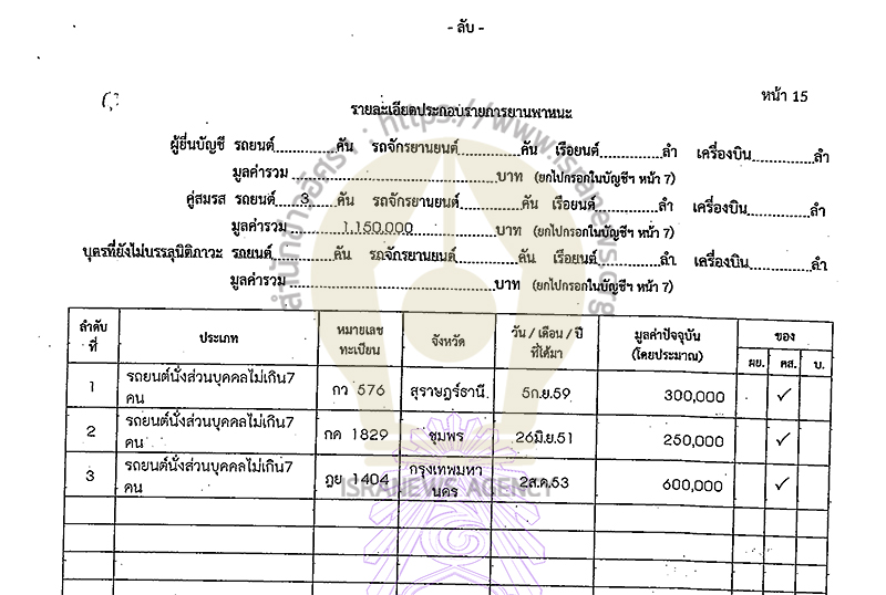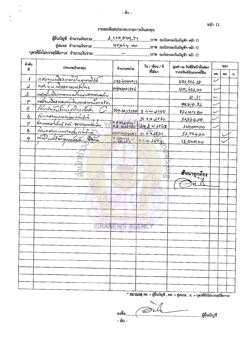 บุตรที่ยังไม่บรรลุนิติภาวะ แจ้งมีทรัพย์สิน 1,023,059.09 บาท จากเงินฝาก (1 บัญชี) 1,159.09 บาท สิทธิและสัมปทาน 1,021,900 บาท