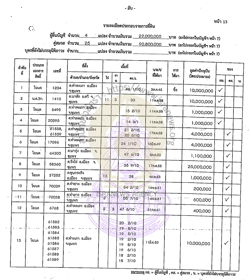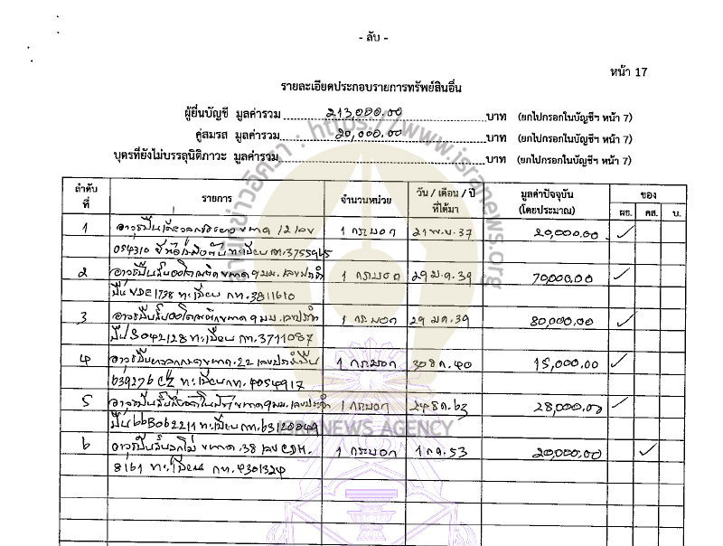 รวมทรัพย์สินทั้งสิ้น 188,096,925.51 บาท (ที่ดิน 29 แปลง ส่วนใหญ่อยู่ในชุมพร รวม 112,800,000 บาท อพาร์ทเม้นท์ อ.เมือง จ.ชุมพร 40,000,000 บาท) หนี้สิน 67,998,504.43 บาท