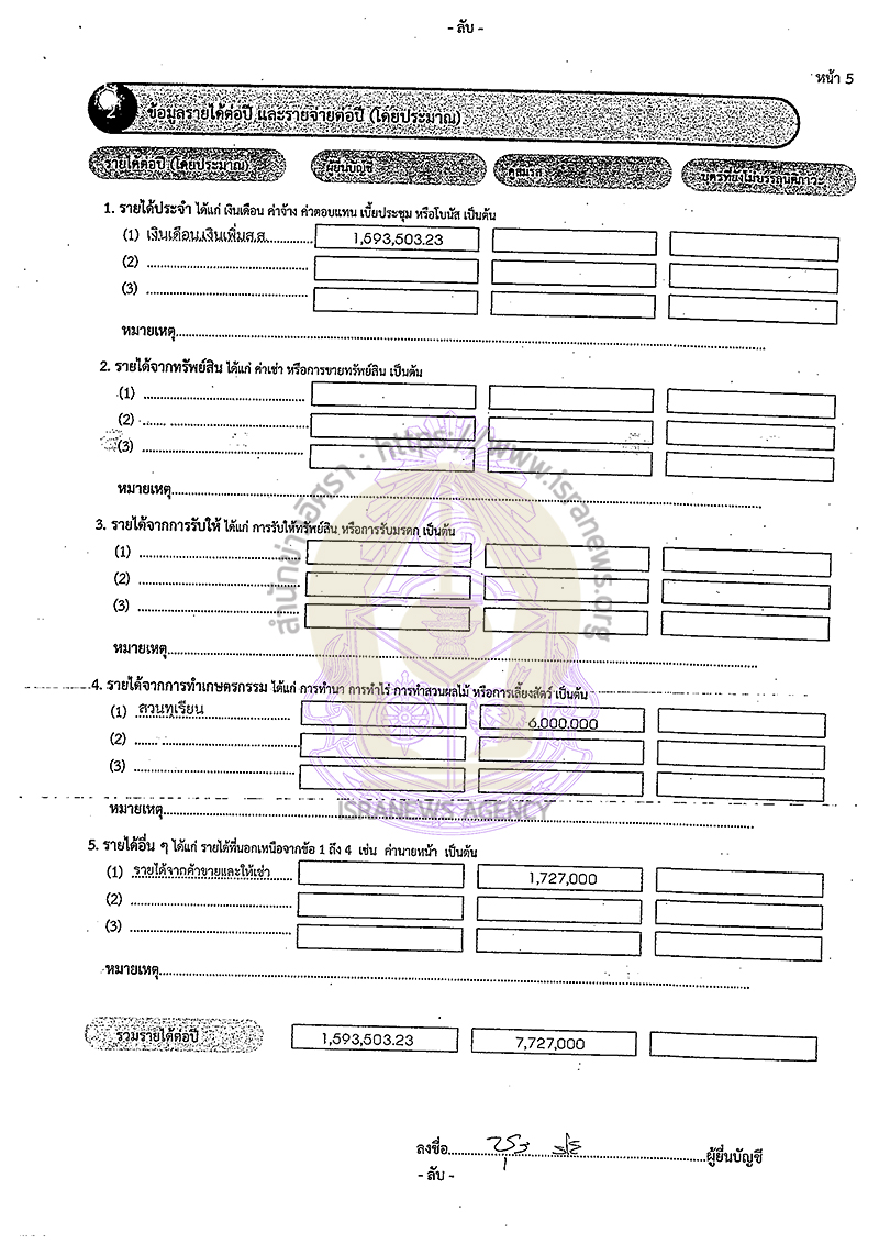 คู่สมรส แจ้งมีรายได้ต่อปี 7,727,000 บาท จากสวนทุเรียน 6,000,000 บาท และรายได้จากการค้าขายและให้เช่า 1,727,000 บาท แจ้งมีรายจ่าย 4,046,400 บาท จาก ค่าใช้จ่ายส่วนตัว 400,000 บาท ค่าน้ำมัน ค่าไฟฟ้า ค่าน้ำประปา 600,000 บาท ค่าเล่าเรียนบุตร 1,000,000 บาท ค่าเบี้ยประกัน 1,000,000 บาท ค่าผ่อนบ้าน 600,000 บาท เงินเดือนพนักงาน 446,400 บาท
