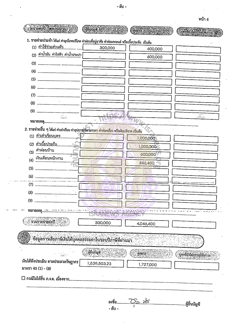 แจ้งมีรายจ่าย 700,000 บาท จากค่าอุปโภคบริโภค 600,000 บาท เงินบริจาค 40,000 บาท ค่าท่องเที่ยว 60,000 บาท