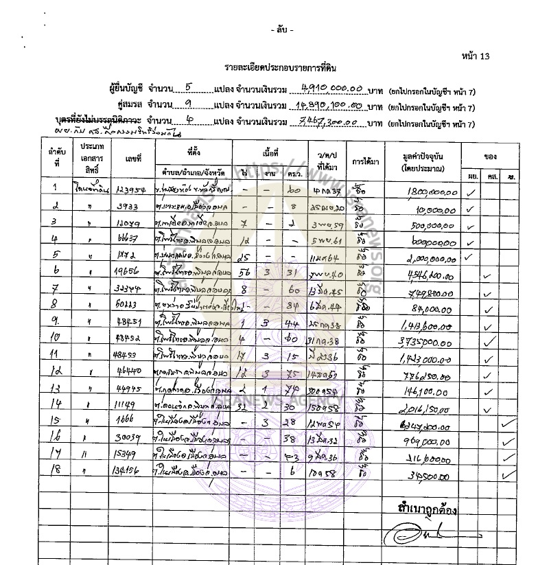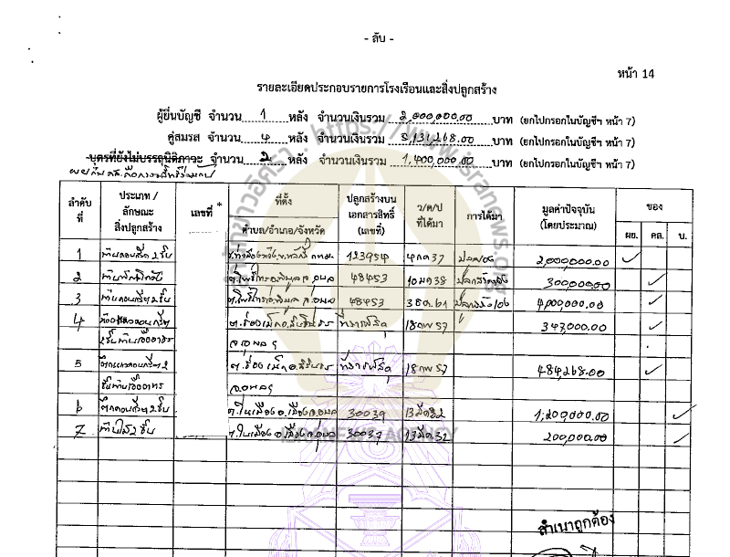 นอกจากนี้ยังมีทรัพย์สินที่ถือกรรมสิทธิ์ร่วมกัน รวม 8,867,300 บาท จากที่ดิน (4 แปลง) 7,467,300 บาท โรงเรือนและสิ่งปลูกสร้าง (2 หลัง) 1,400,000 บาท
