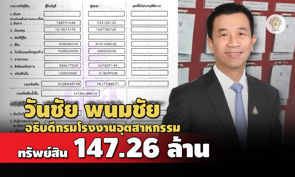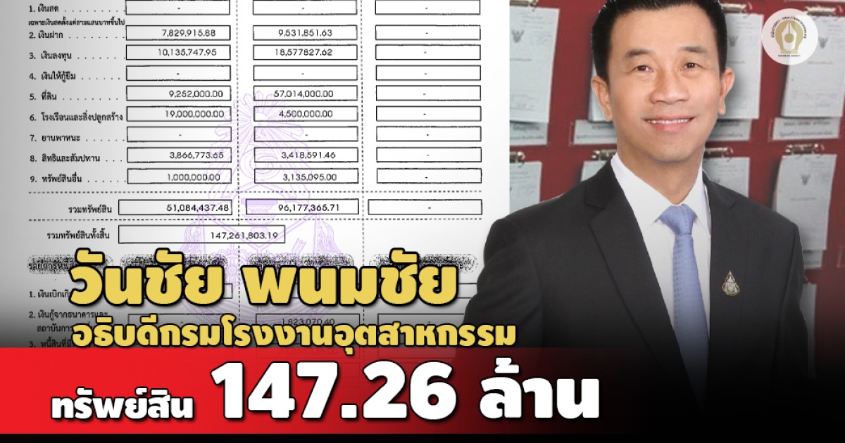 ทรัพย์สิน 147.26 ล้านบาท 'วันชัย พนมชัย' อธิบดีกรมโรงงานอุตสาหกรรม - ภรรยานักธุรกิจ มีที่ดินรวม 66 ไร่ 66.26 ล้านบาท เงินลงทุน 28.71 ล้านบาท พระเครื่อง 40 องค์ ทองรูปพรรณ 77 ชิ้น ทองคำแท่ง 4 ก้อน