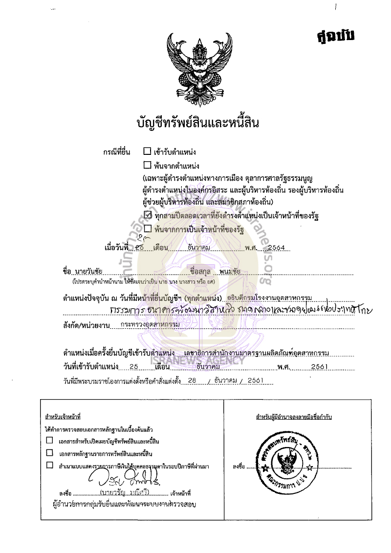 ผู้สื่อข่าวรายงานว่า เมื่อวันที่ 10 มี.ค.2565 สำนักงานคณะกรรมการป้องกันและปราบปรามการทุจริตแห่งชาติ (ป.ป.ช.) เปิดเผยบัญชีทรัพย์สินและหนี้สินและเอกสารประกอบของผู้ดำรงตำแหน่งระดับสูง รายของ นายวันชัย พนมชัย อธิบดีกรมโรงงานอุตสาหกรรม (กรอ.) และ กรรมการธนาคารพัฒนาวิสาหกิจขนาดกลางและขนาดย่อมแห่งประเทศไทย กรณีทุก 3 ปีตลอดเวลาที่ยังดำรงตำแหน่งเป็นเจ้าหน้าที่ของรัฐ เมื่อวันที่ 25 ธ.ค.2564