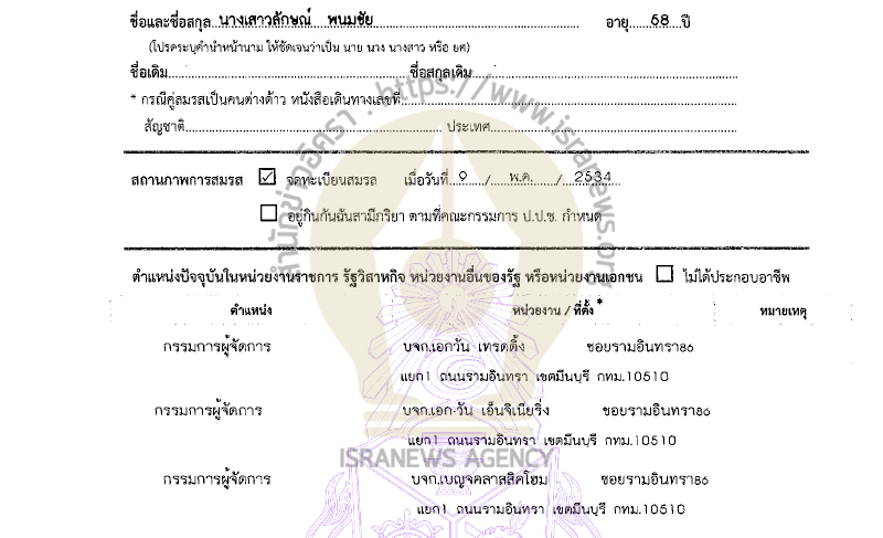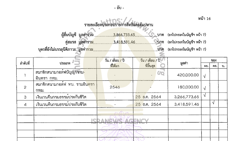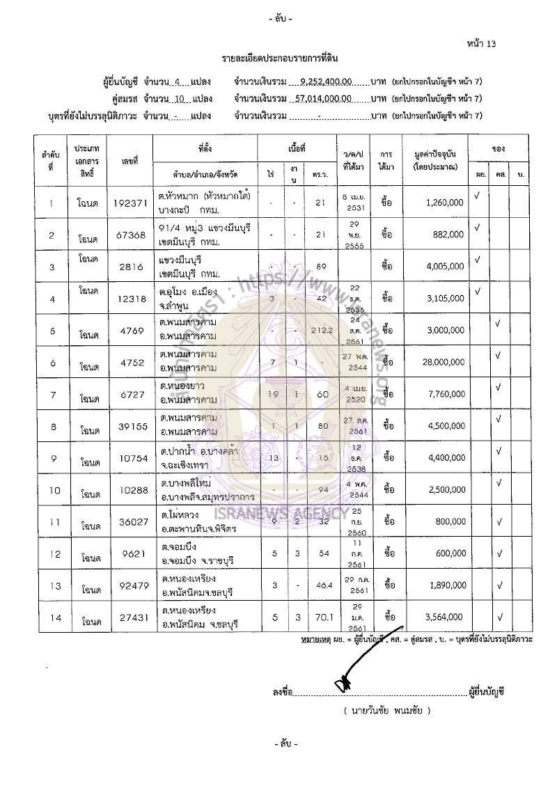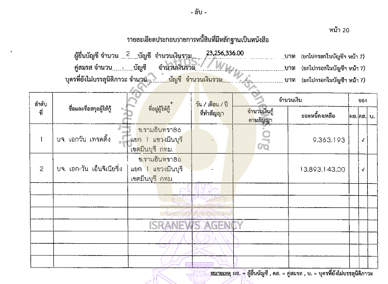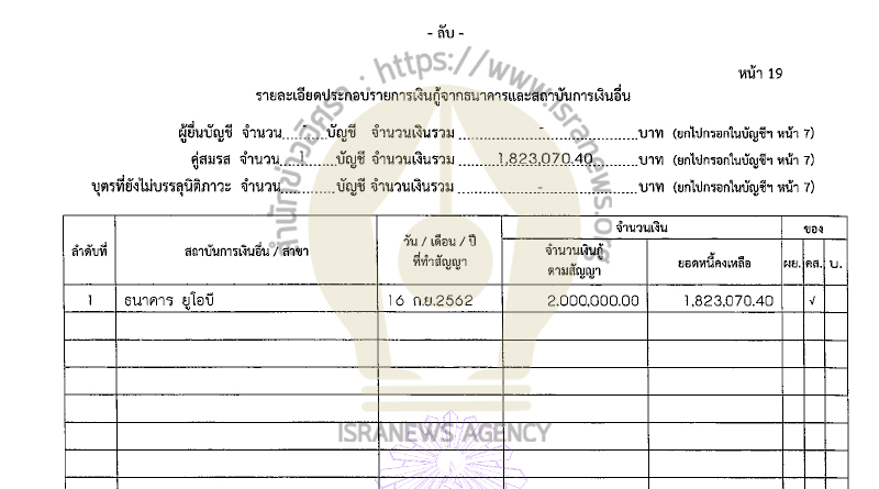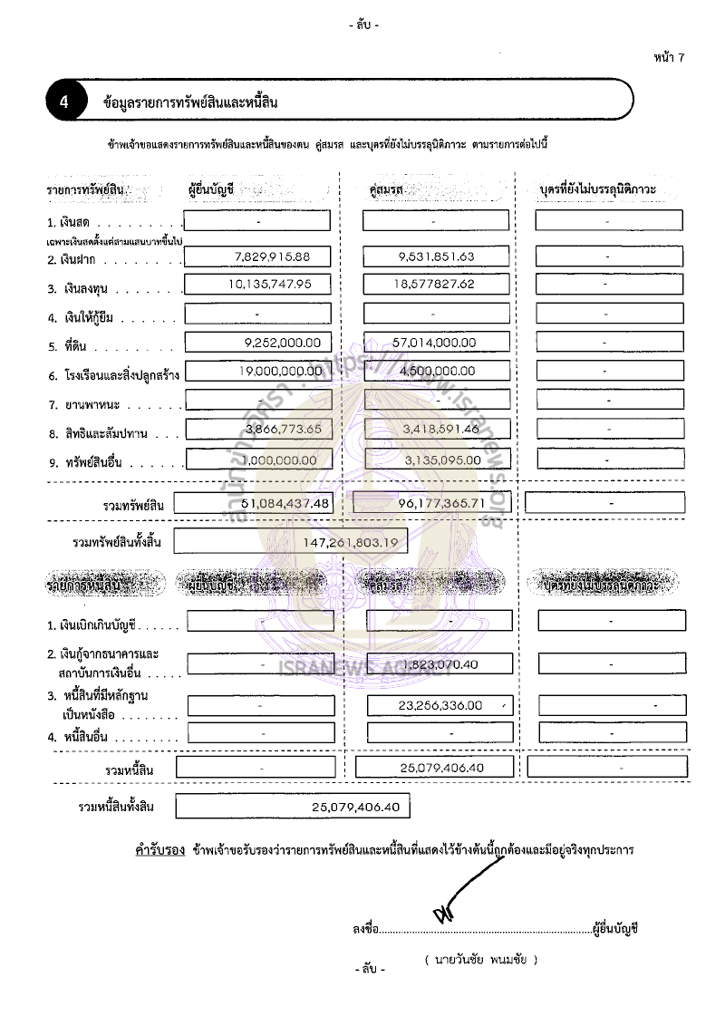 แจ้งมีหนี้สิน 25,079,406.40 บาท จากเงินกู้ธนาคาร 1,823,070.40 บาท หนี้สินที่มีหลักฐานเป็นหนังสือ 23,256,336 บาท