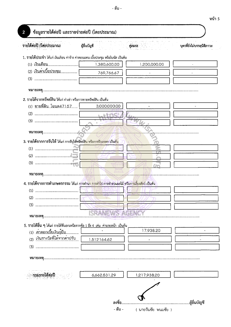 คู่สมรส แจ้งมีรายได้ต่อปี 1,217,938.20 บาท จากเงินเดือน 1,200,000 บาท ค่าดอกเบี้ยเงินกู้ยืม 17,938.20 บาท
