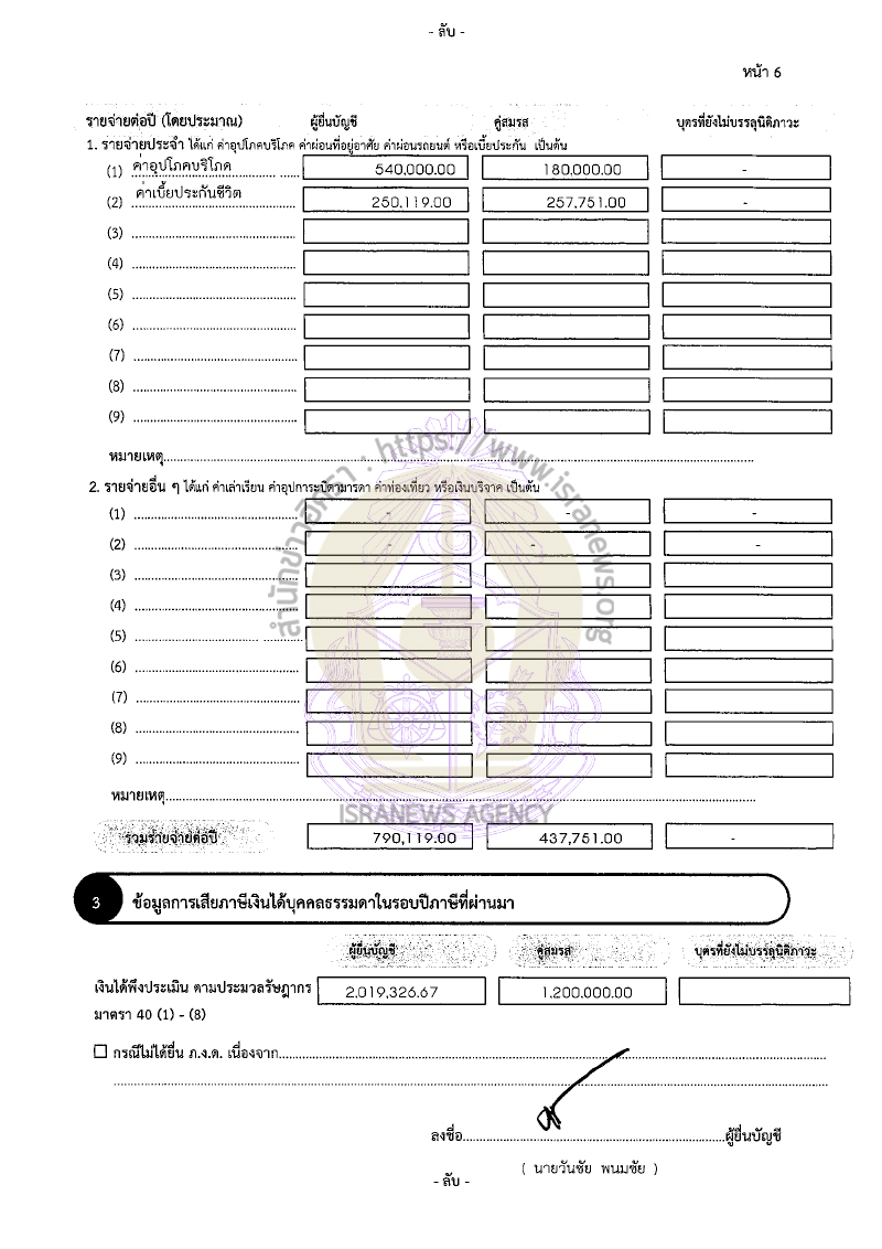 แจ้งมีรายจ่าย 790,119 บาท จากค่าอุปโภคบริโภค 540,000 บาท ค่าเบี้ยประกันชีวิต 250,119 บาท