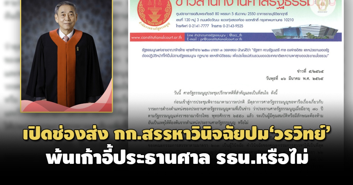 ผู้สื่อข่าวรายงานว่า เมื่อวันที่ 16 มี.ค.2565 ศาลรัฐธรรมนูญเผยแพร่เอกสาร ระบุว่า วันนี้ ศาลรัฐธรรมนูญประชุมปรึกษาดีที่สำคัญและเป็นที่สนใจ ดังนี้ ก่อนเข้าสู่การประชุมพิจารณาตามวาระปกติ มีตุลาการศาลรัฐธรรมนูญขอหารือเรื่องเกี่ยวกับวาระการดำรงตำแหน่งของประธานศาลรัฐธรรมนูญตามที่เป็นข่าว ว่า นายวรวิทย์ กังศศิเทียม ประธานศาลรัฐธรรมนูญเมื่อมีอายุ 70 ปี ตามรัฐธรรมนูญแห่งราชอาณาจักรไทย พุทธศักราช 2550 แล้ว จะเป็นผู้มีคุณสมบัติหรือมีลักษณะต้องห้าม อันเป็นเหตุให้ต้องพันจากตำแหน่งประธานศาลรัฐธรรมนูญ หรือไม่